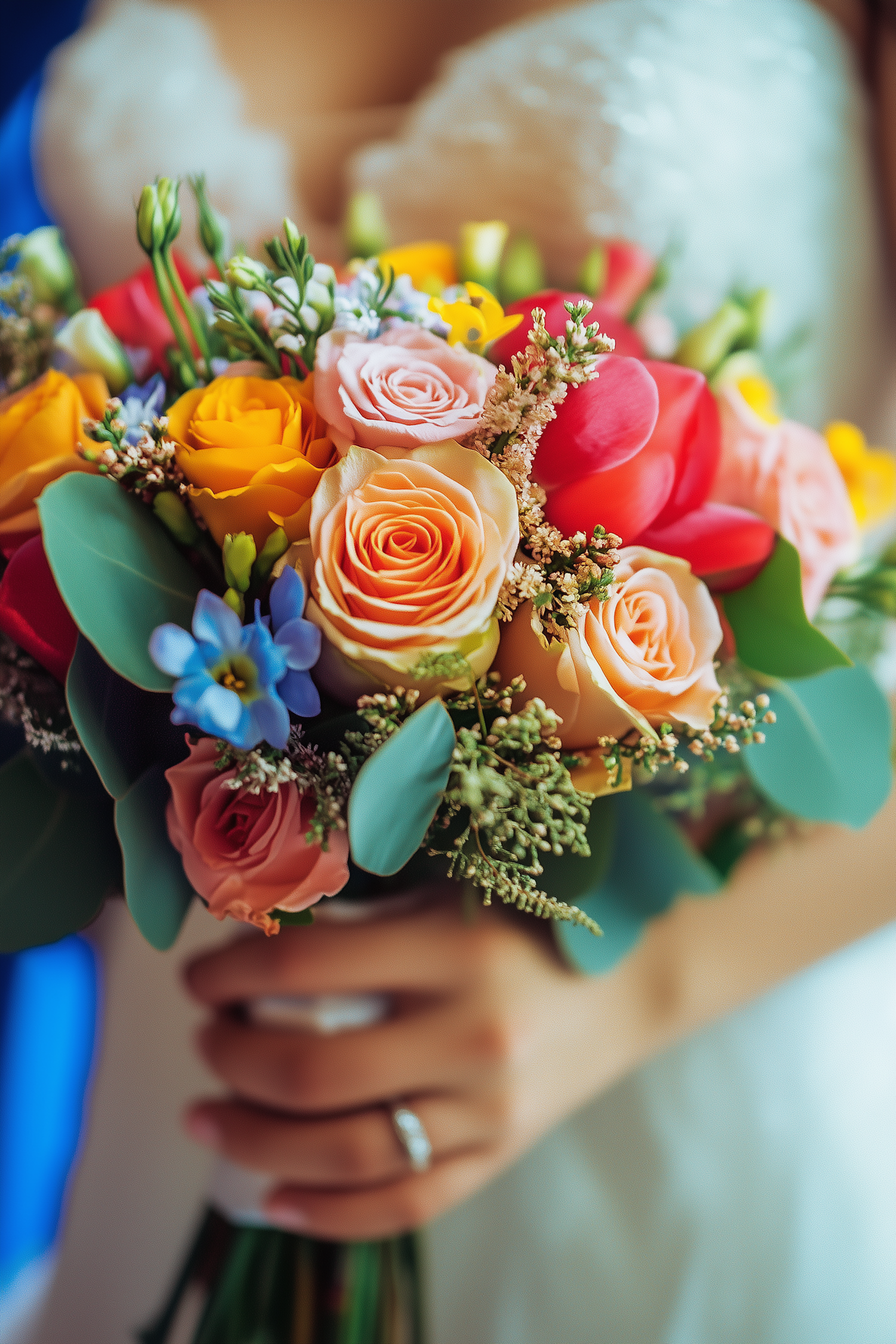 Colorful bridal bouquet with roses, tulips, and greenery, held by a bride in a white dress, highlighting wedding elegance.