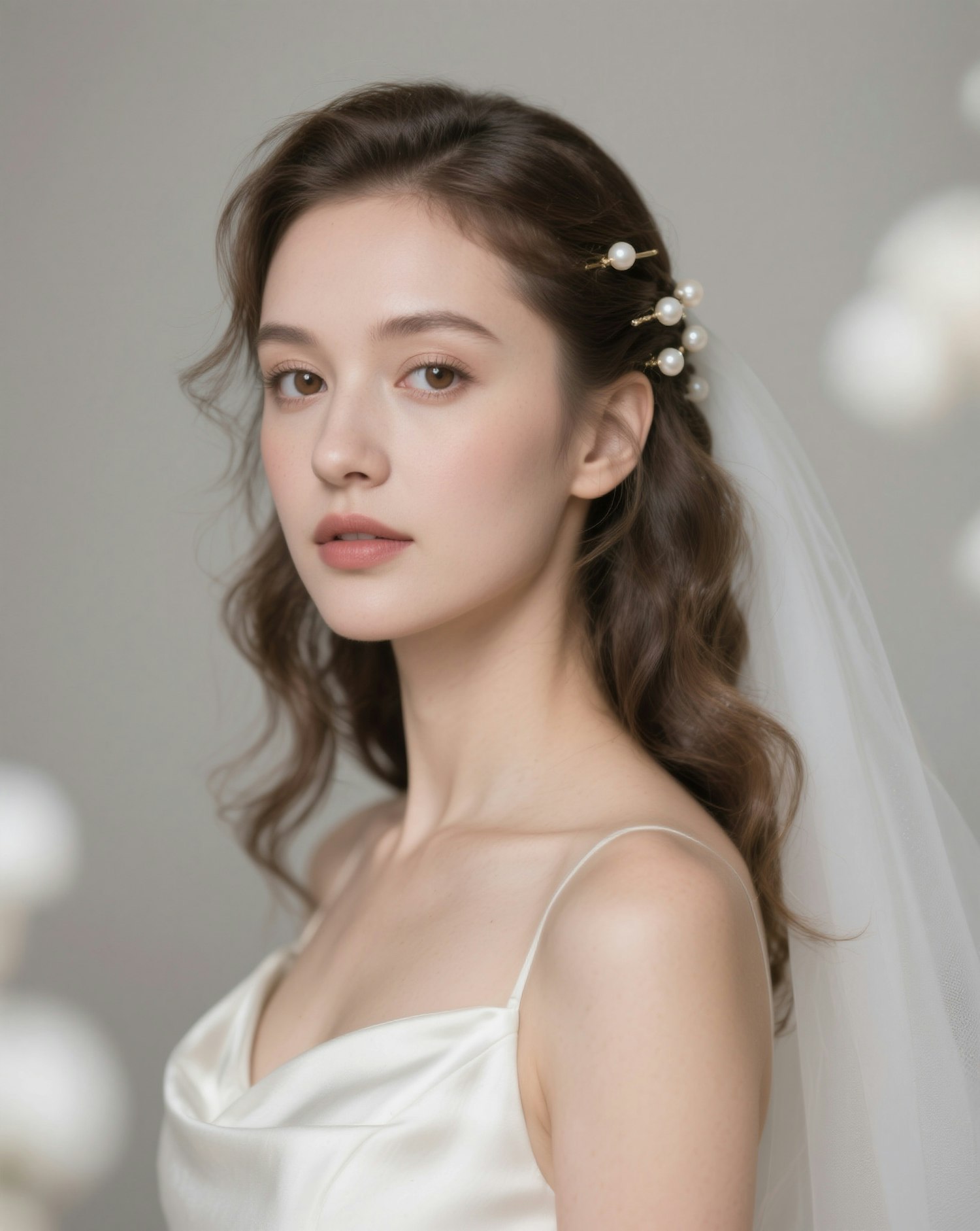 Elegant bridal portrait featuring a woman with wavy brown hair, pearl hairpins, and a white satin dress, set against a soft neutral background.