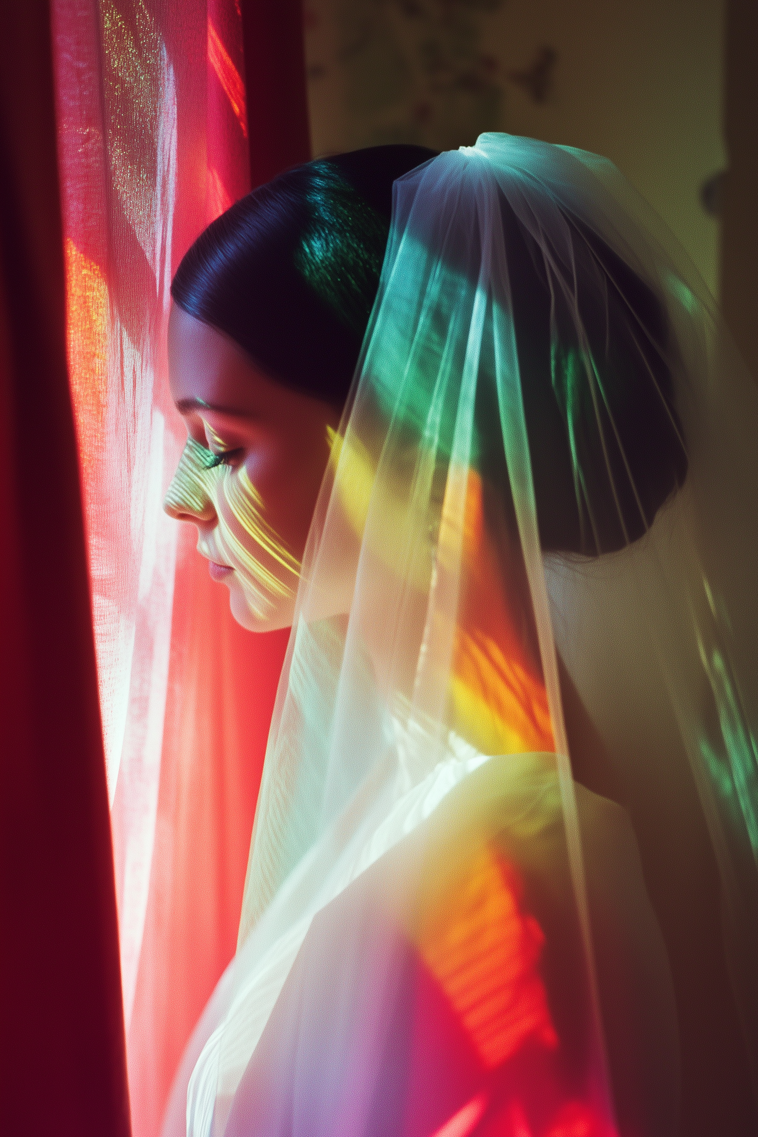 A serene bride in profile, illuminated by colorful light through a window, with a white veil and dark hair in a sleek bun.
