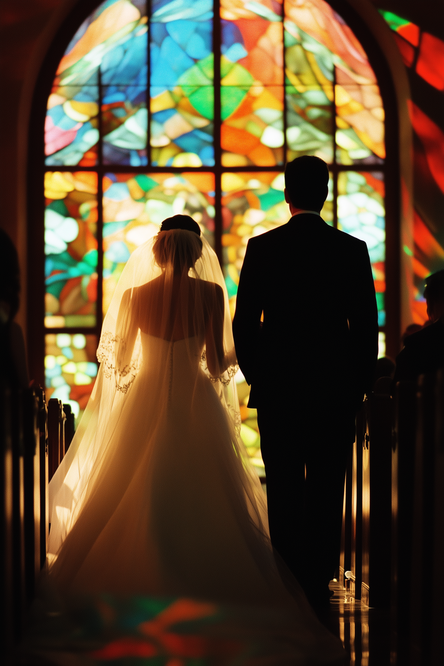 Bride and groom silhouetted against a vibrant stained glass window, creating a romantic and ethereal church scene.