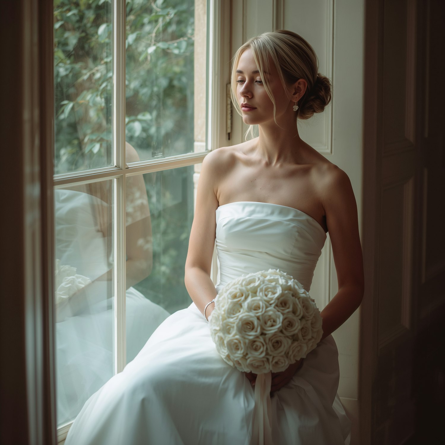 A serene bride in a white gown holding a rose bouquet, seated by a window with soft natural light and a view of greenery.