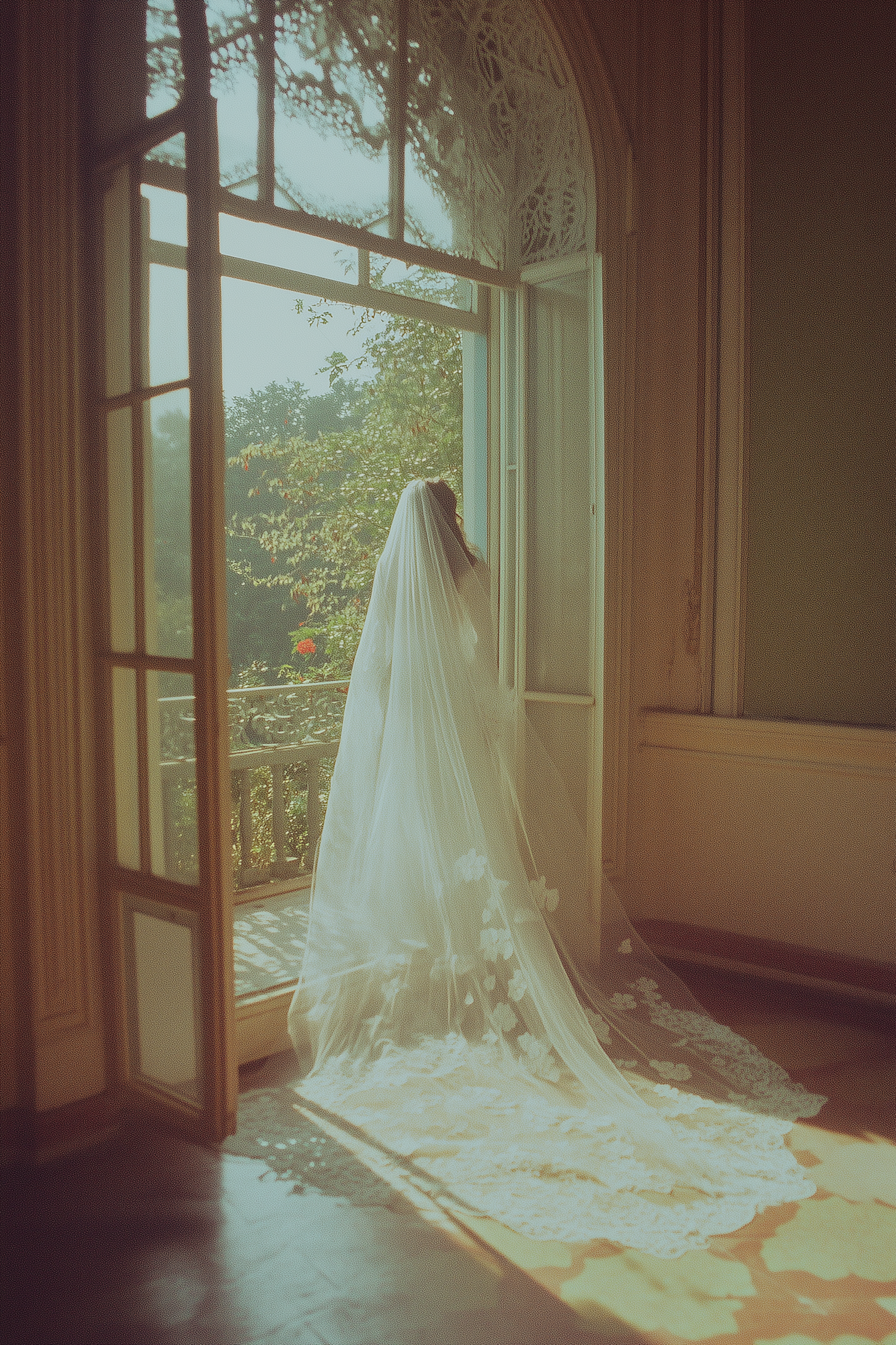 Bride in elegant white veil stands by open French doors, gazing at sunlit balcony with lush greenery. Romantic and serene atmosphere.