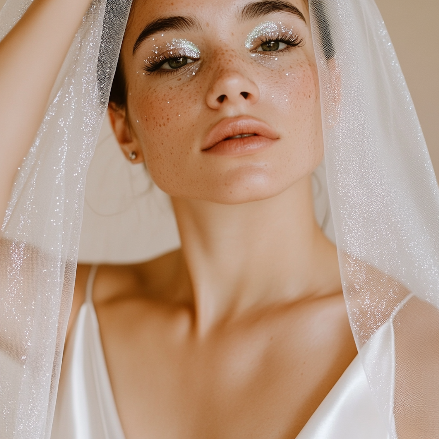 Close-up of a freckled woman in a shimmering veil, with glittery eyeshadow and a serene expression, wearing a white satin dress.