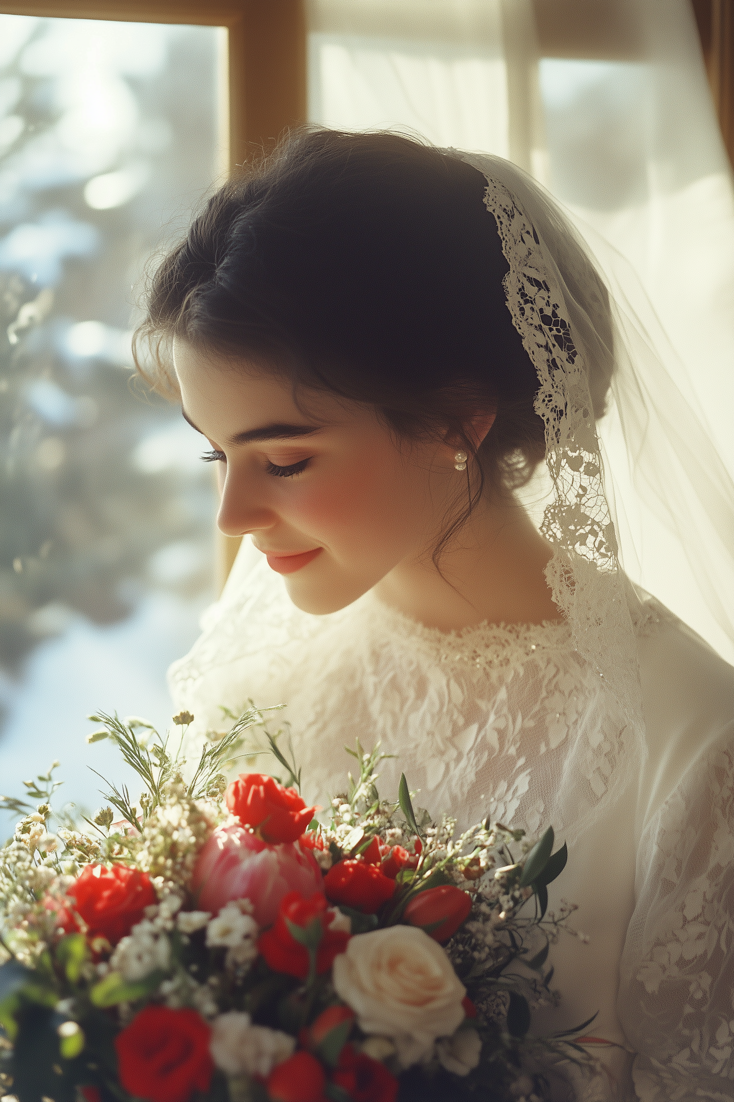 Bride in lace gown with a vibrant bouquet, gazing serenely. Soft light highlights her elegant veil and intricate dress details.