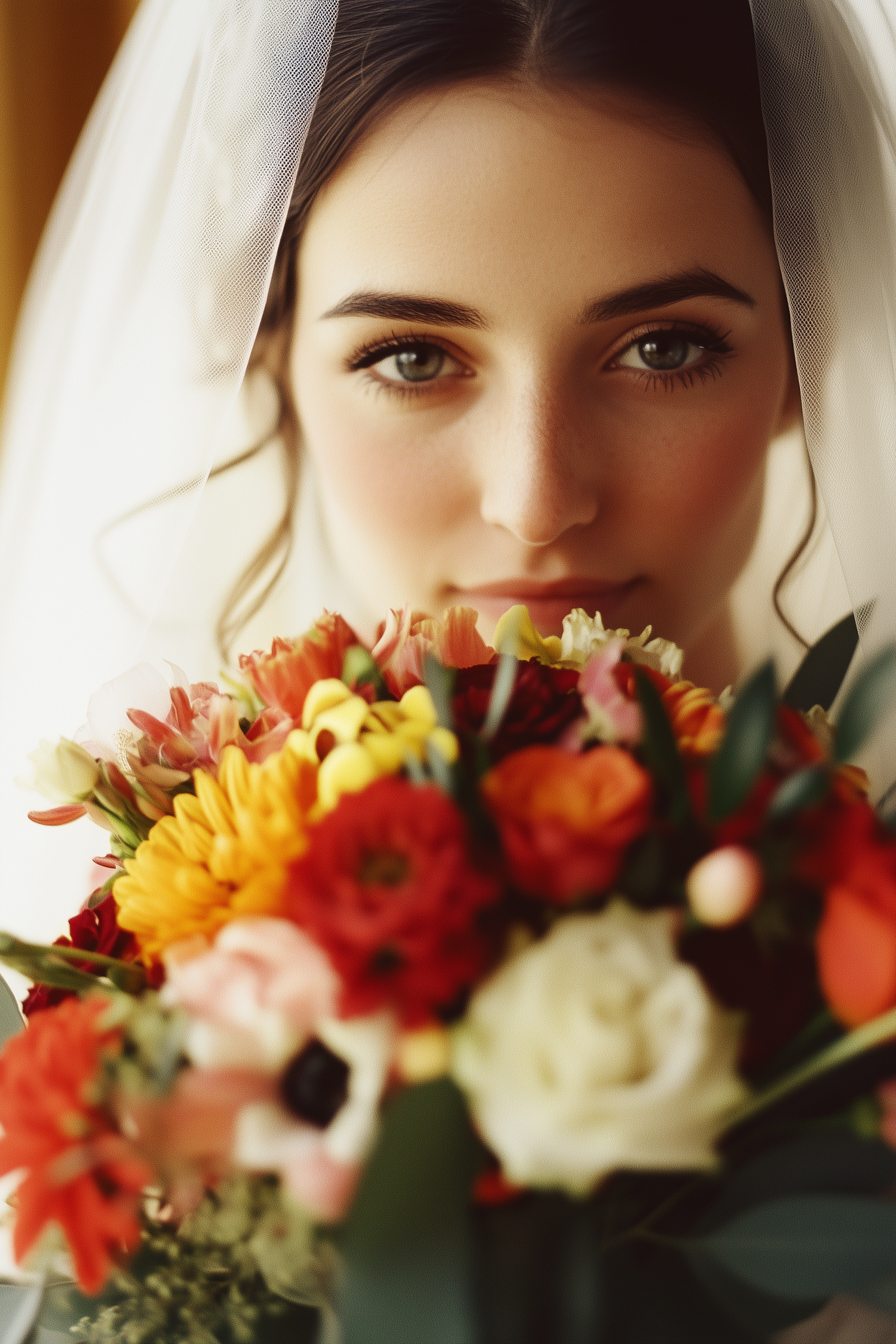 Bride with a vibrant bouquet, soft gaze, and delicate veil, creating a dreamy and romantic atmosphere.