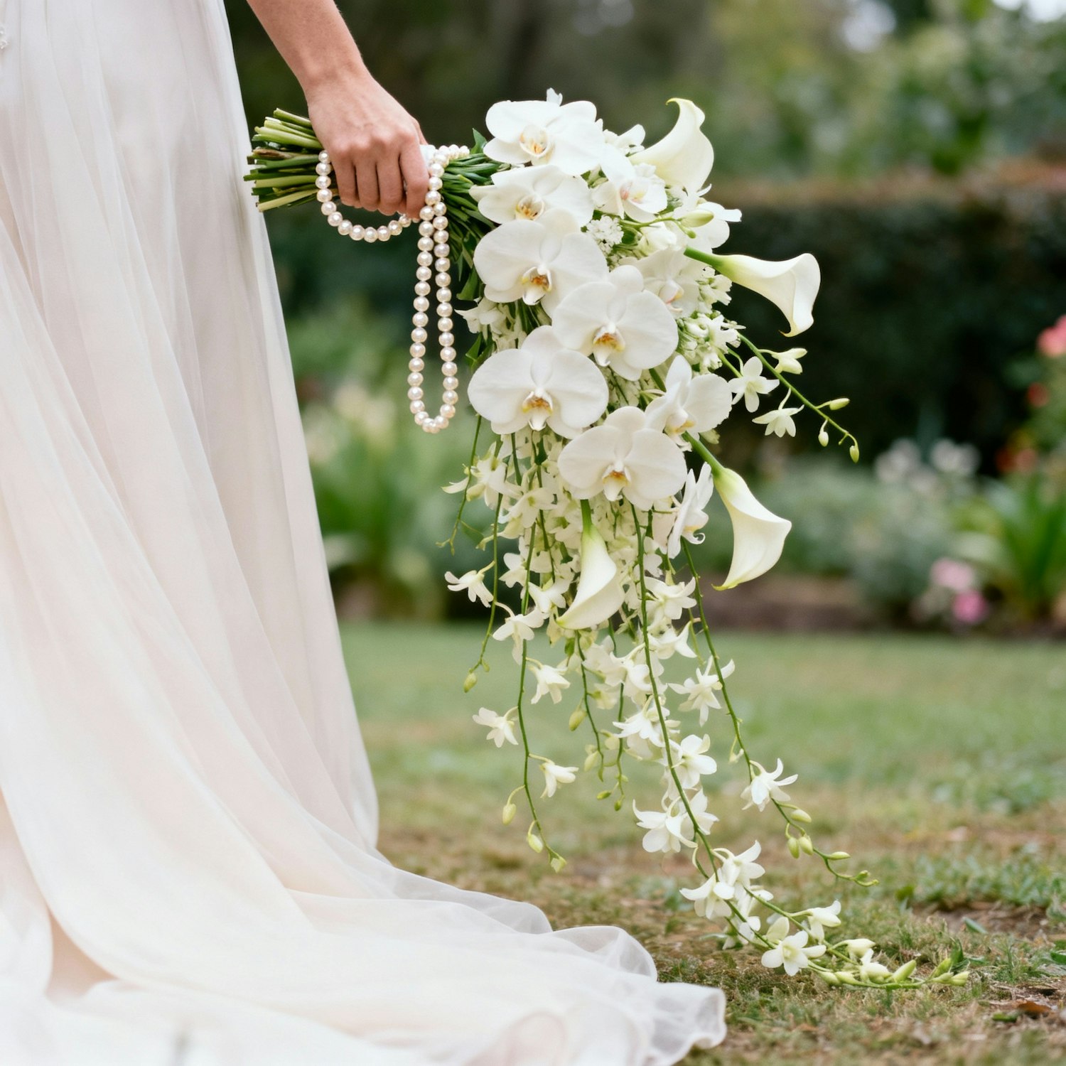 Gentle outdoor bridal photoshoot of a bouquet with pearl bead handles, arranged in a natural cascading flow. White orchids, calla lilies, and trailing jasmine vines fall loosely, not perfectly symmetrical. Bride’s hand and part of her gown visible, soft garden background, quiet luxury, organic and realistic.