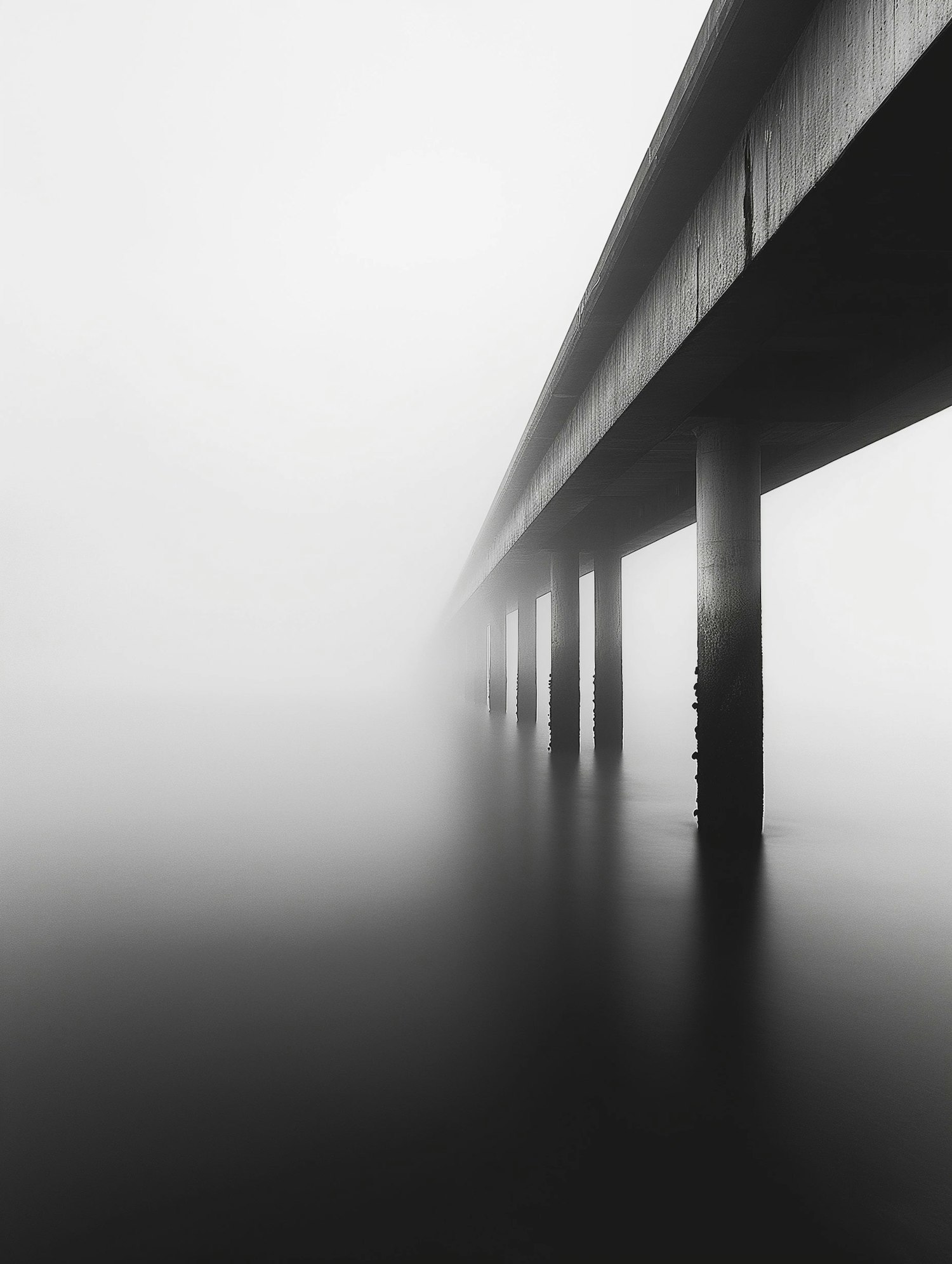 Black-and-white photo of a bridge extending into dense fog, supported by tall pillars over calm water, creating a serene, minimalist scene.