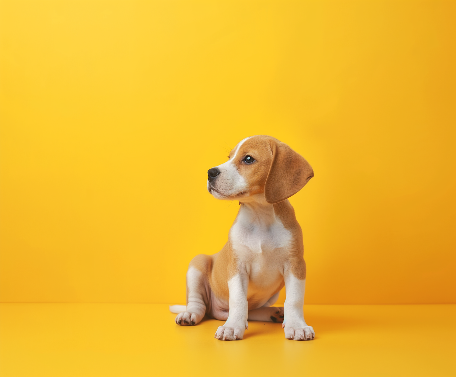 Adorable beagle puppy sitting against a bright yellow background, showcasing its cute expression and floppy ears.