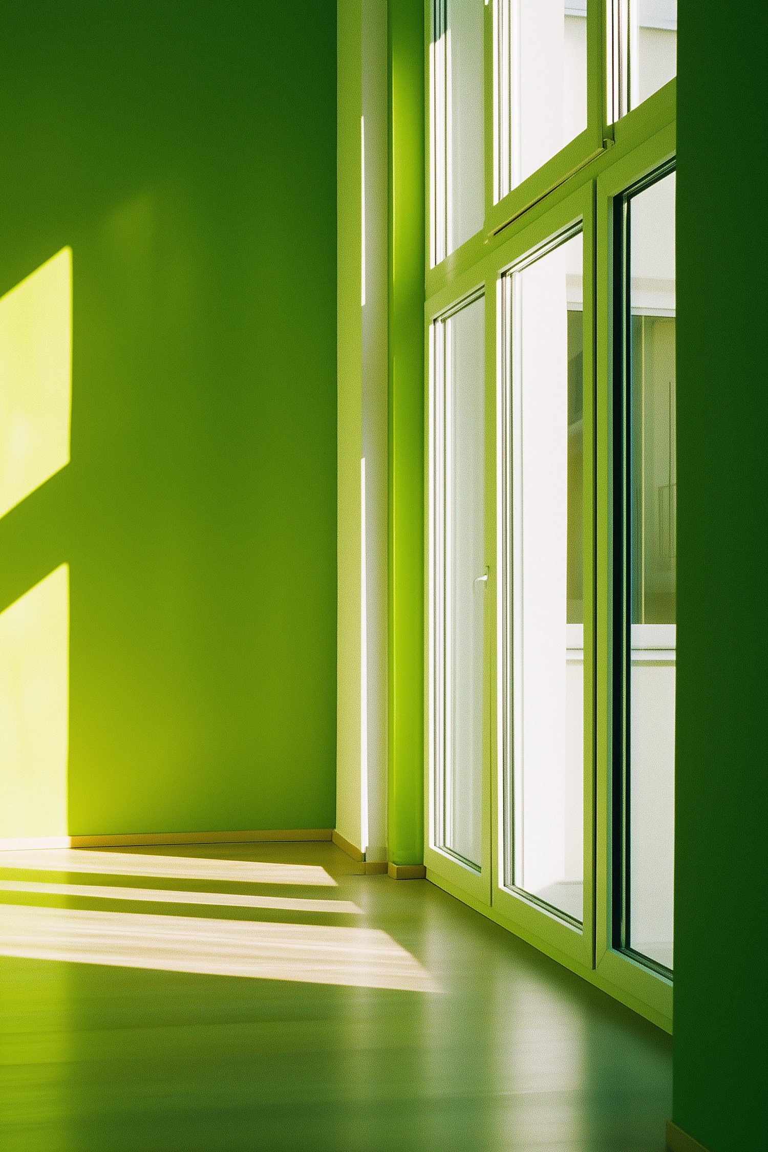 Bright room with green walls, large windows, and sunlight casting shadows on a wooden floor. Modern, minimalistic, and vibrant design.