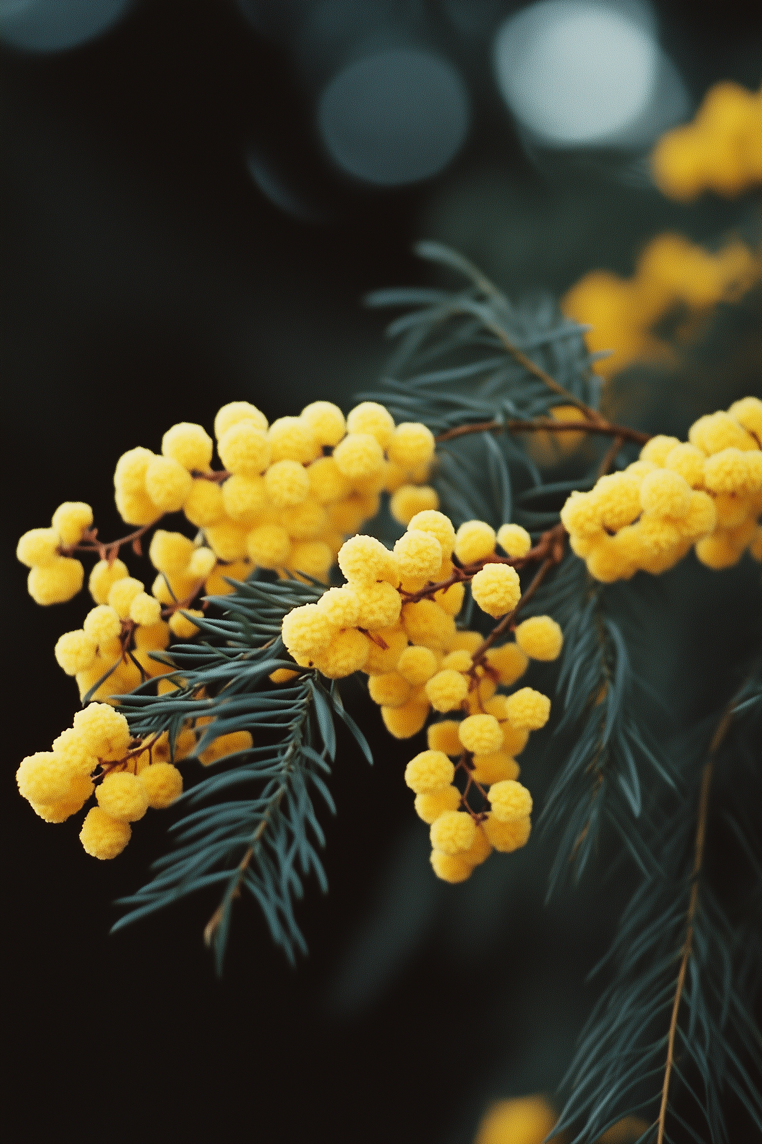 Bright yellow mimosa flowers with feathery green leaves, set against a blurred dark background for a vibrant and serene look.