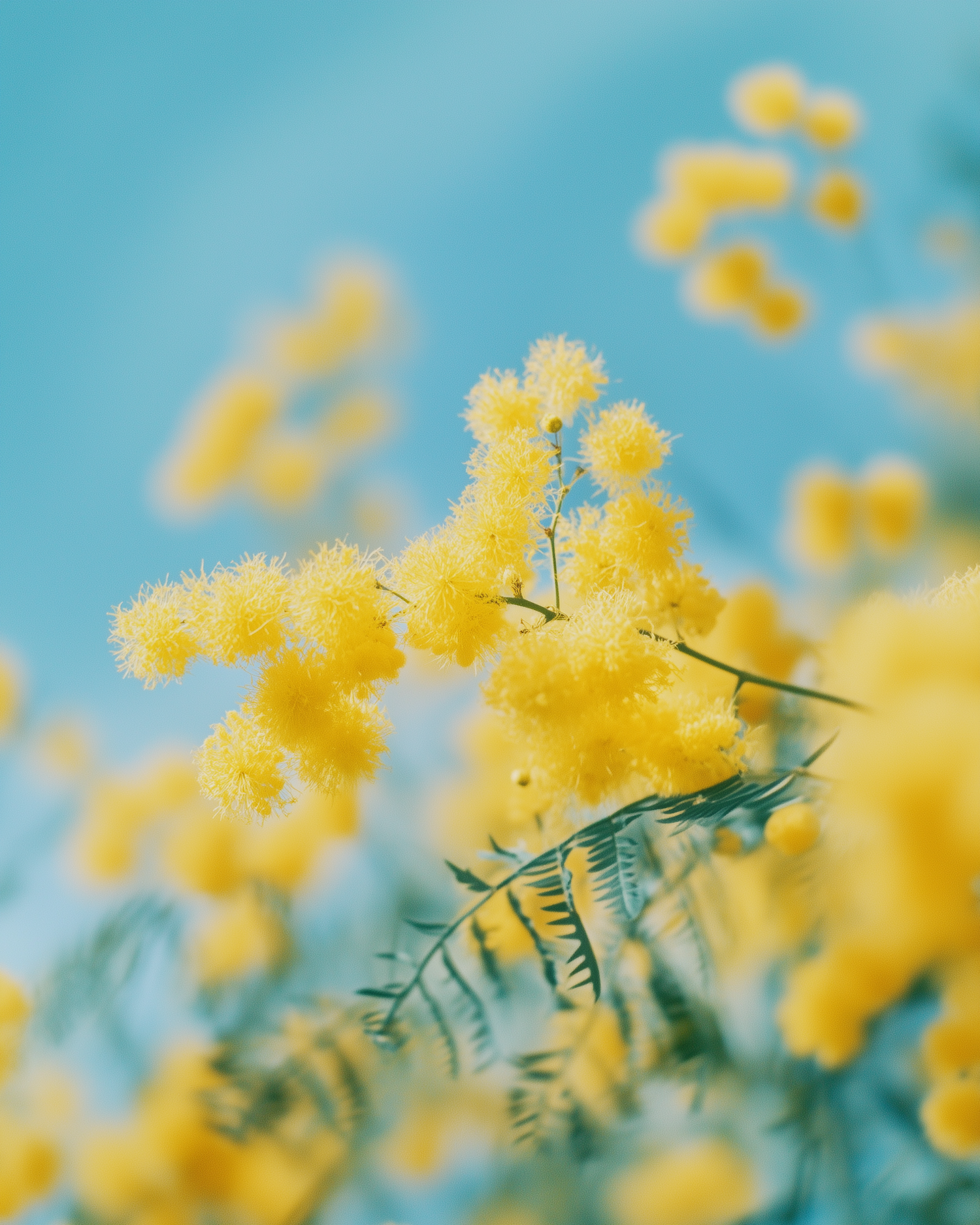 Vivid yellow mimosa flowers with delicate green leaves pop against a dreamy turquoise background, creating a serene springtime vibe.