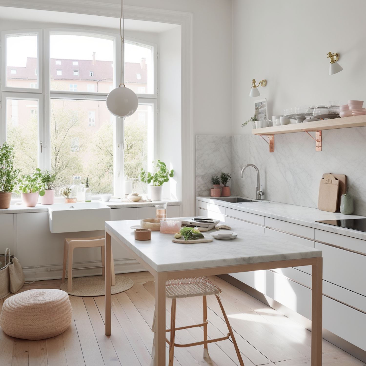 Bright Scandinavian kitchen with marble countertops, large window, and potted plants. Light wood accents create a cozy, airy feel.