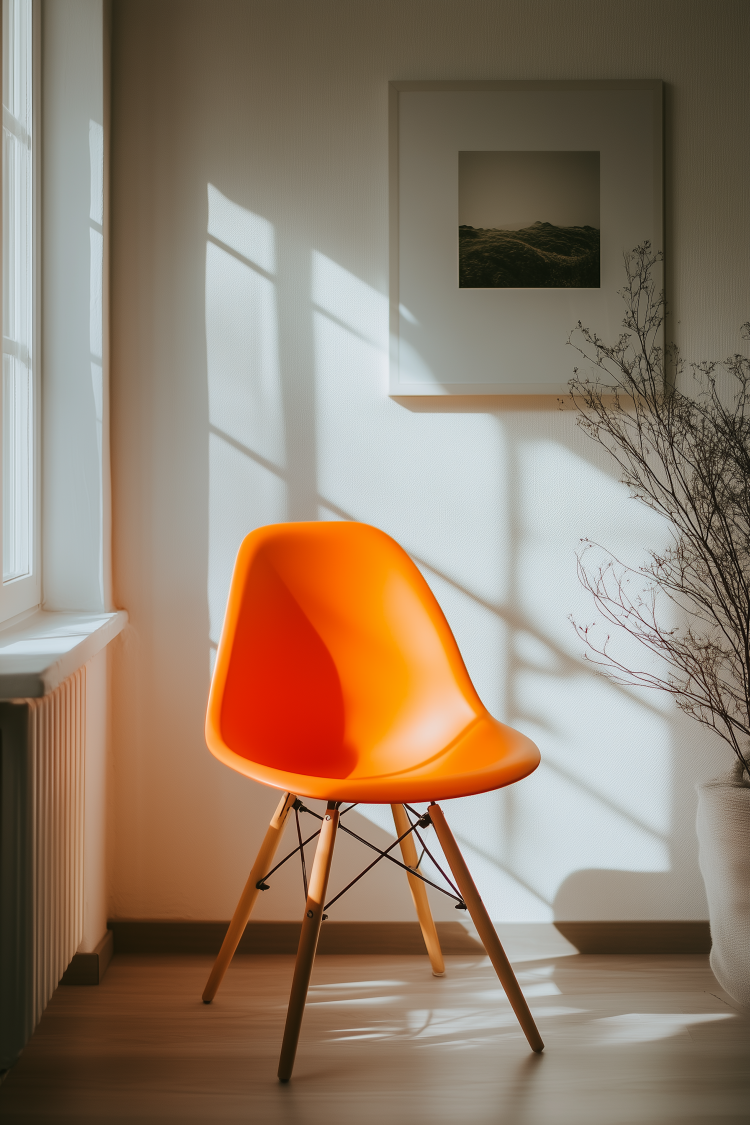 Bright orange modern chair in a minimalist room with sunlight, a framed photo, and dried branches for a warm, stylish ambiance.