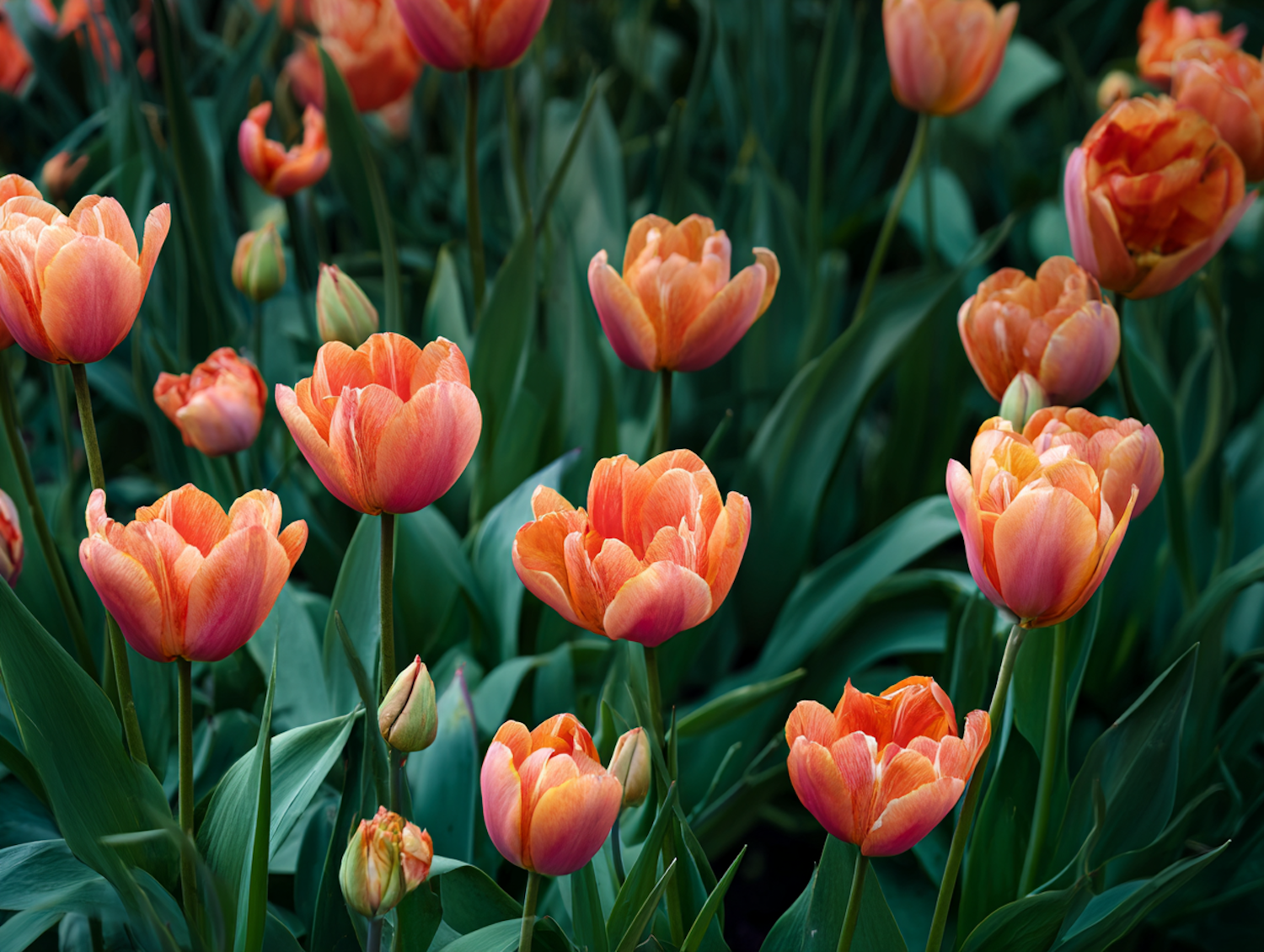 A vivid cluster of orange tulips in full bloom surrounded by lush green leaves, creating a vibrant display of natural beauty.