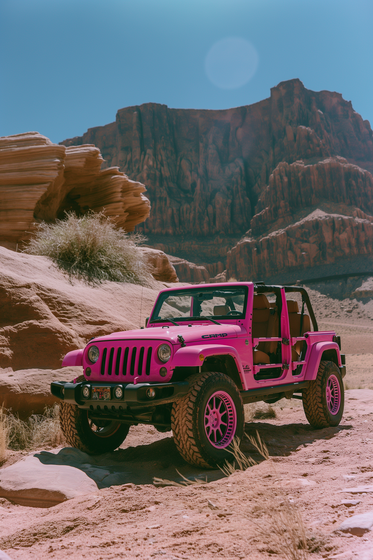 Bright pink off-road vehicle in a desert landscape with rugged rock formations and clear blue sky, ready for adventure.