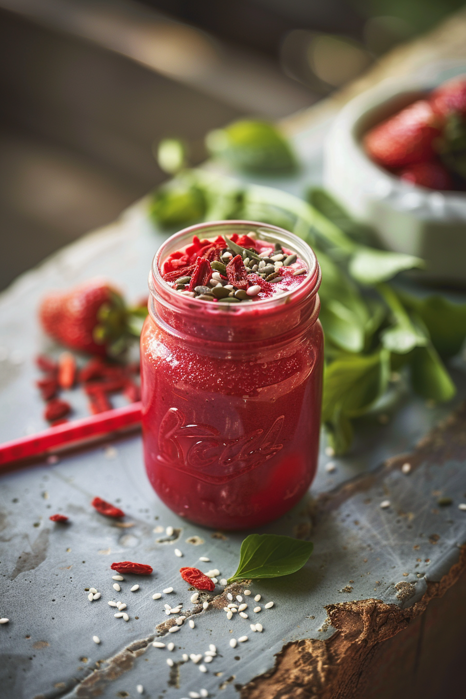 Vibrant red smoothie in a mason jar topped with seeds and goji berries, set on a rustic wooden surface with fresh strawberries nearby.