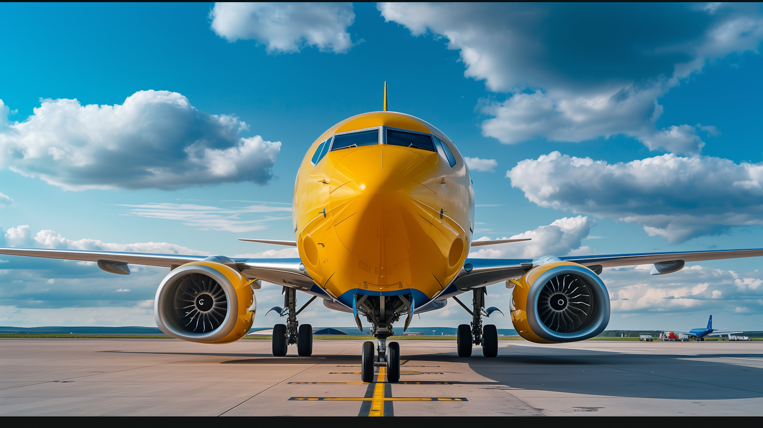 Front view of a yellow airplane on a runway with a blue sky and clouds, showcasing its engines and sleek design.
