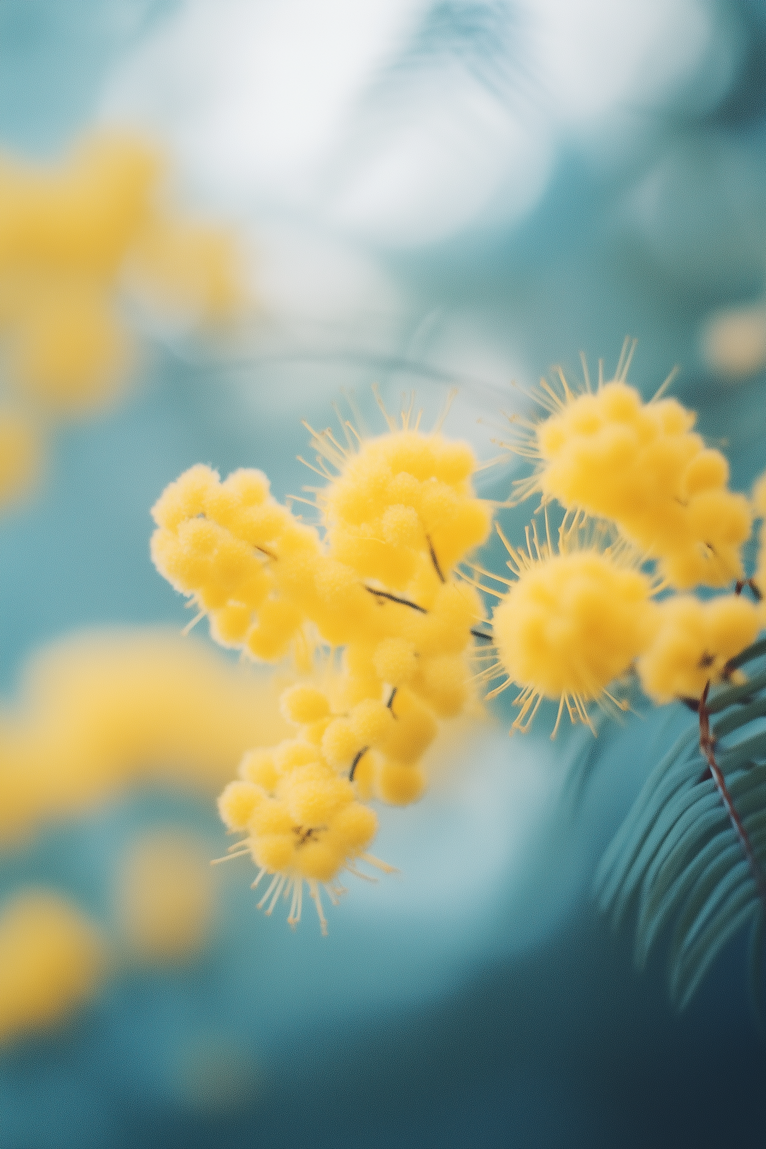 Close-up of vibrant yellow mimosa flowers with soft teal background, showcasing their fluffy texture and delicate filaments.