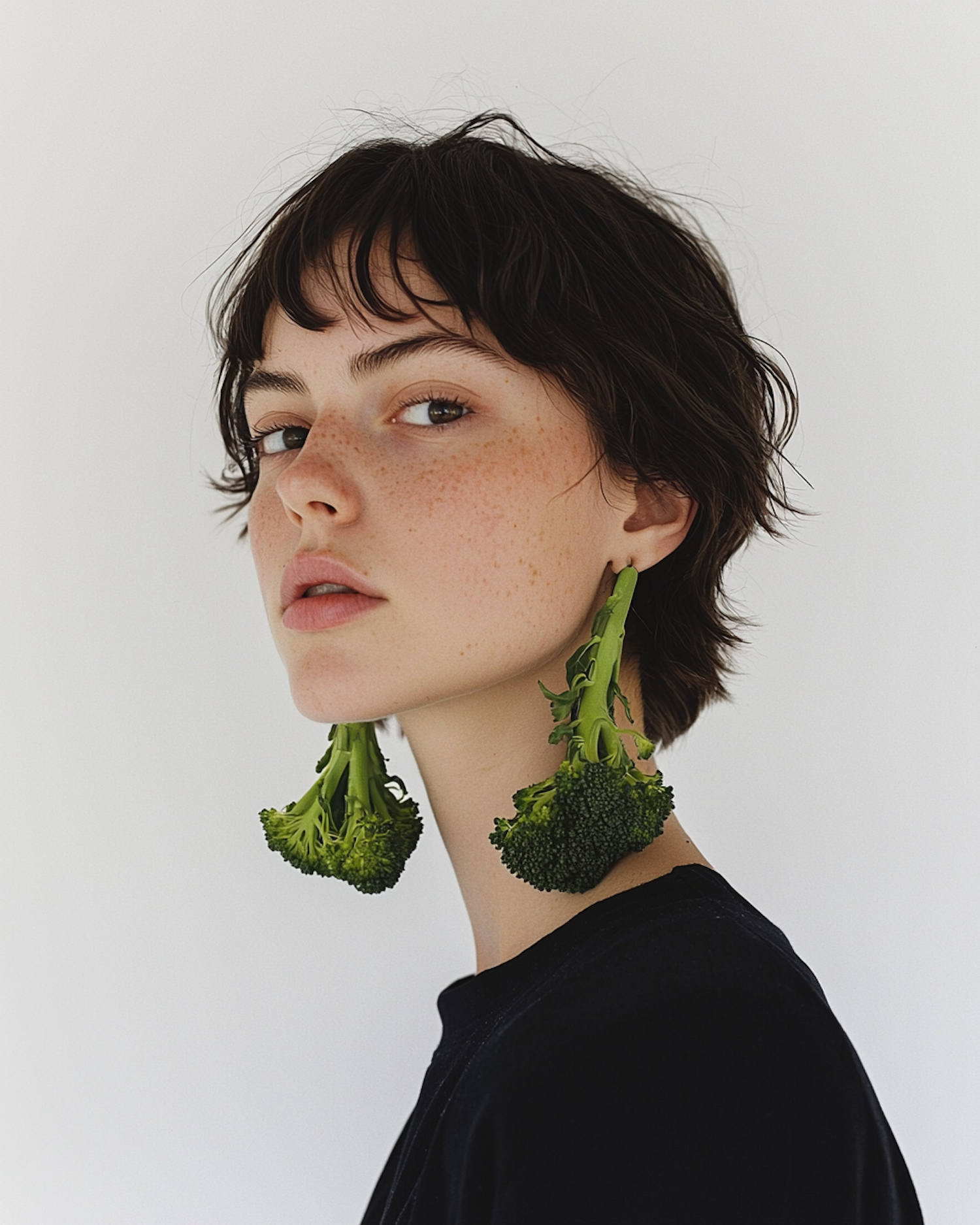 A young woman with broccoli earrings, short dark hair, and freckles poses against a white background in a minimalist, artistic style.