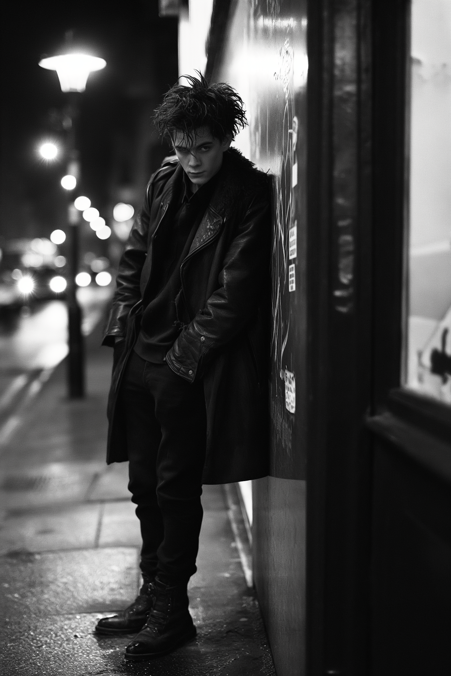 Moody black and white photo of a young man in a leather coat leaning against a wall at night, with streetlights in the background.
