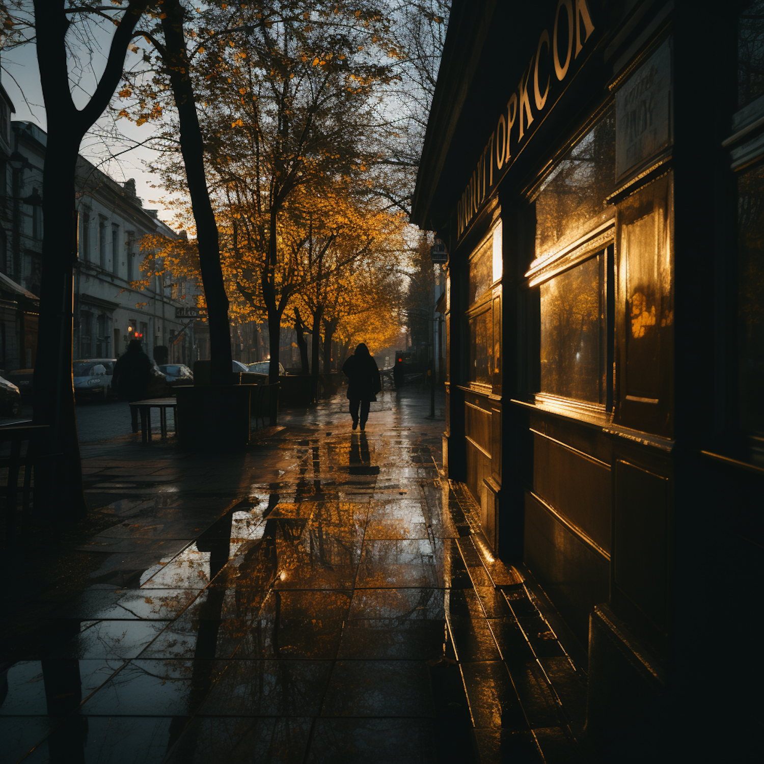 A silhouette walks on a wet sidewalk at sunset, with golden trees and reflections creating a serene, dramatic scene.