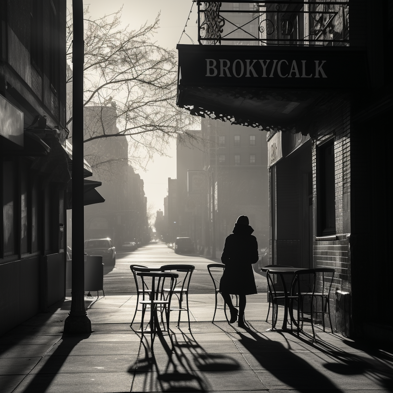 Moody black and white city street scene with a solitary figure, long shadows, and empty tables. Atmospheric and evocative urban setting.