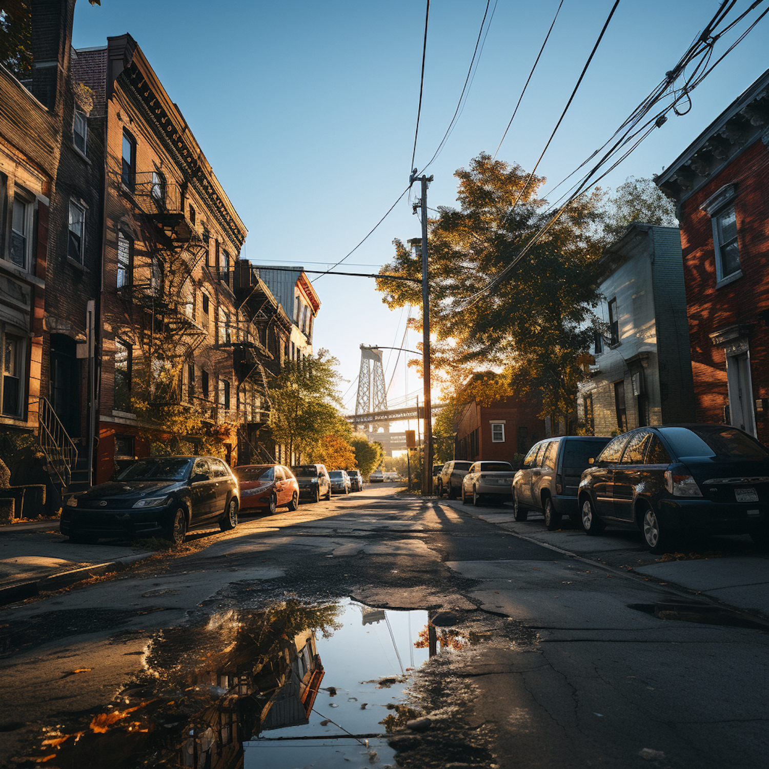 Sunrise over a quiet urban street with parked cars, brick buildings, and a distant bridge. Warm light and reflections create a serene scene.