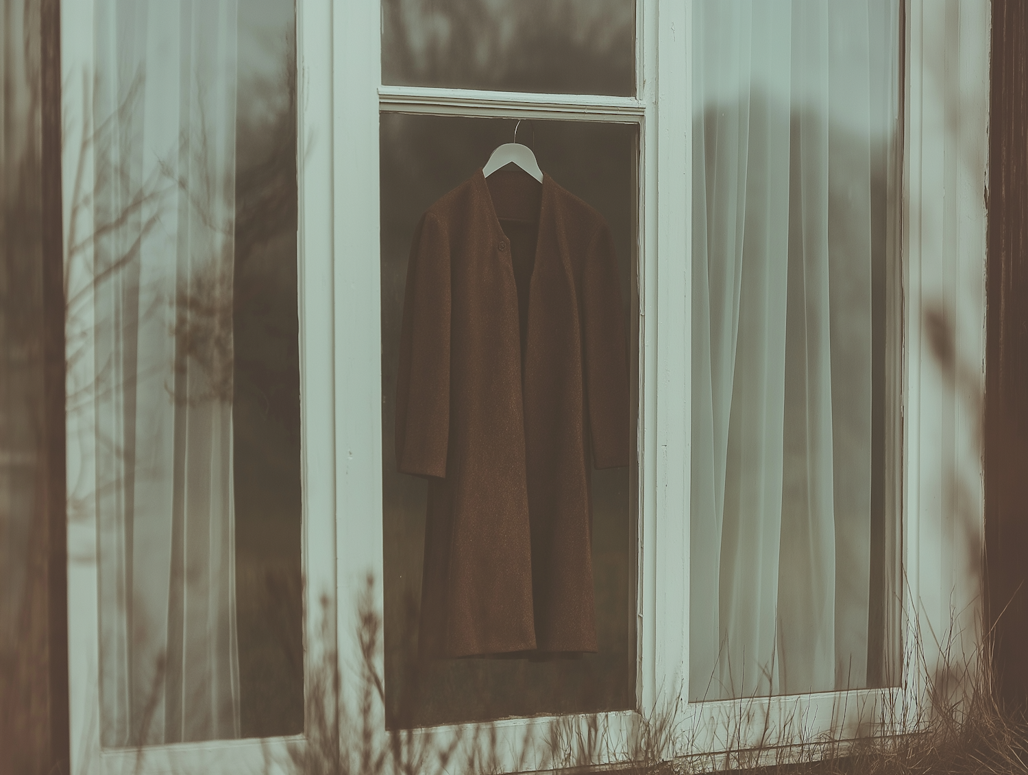 A brown coat on a hanger inside a window with white curtains, framed by a wooden structure, in a warm, sepia-toned setting.