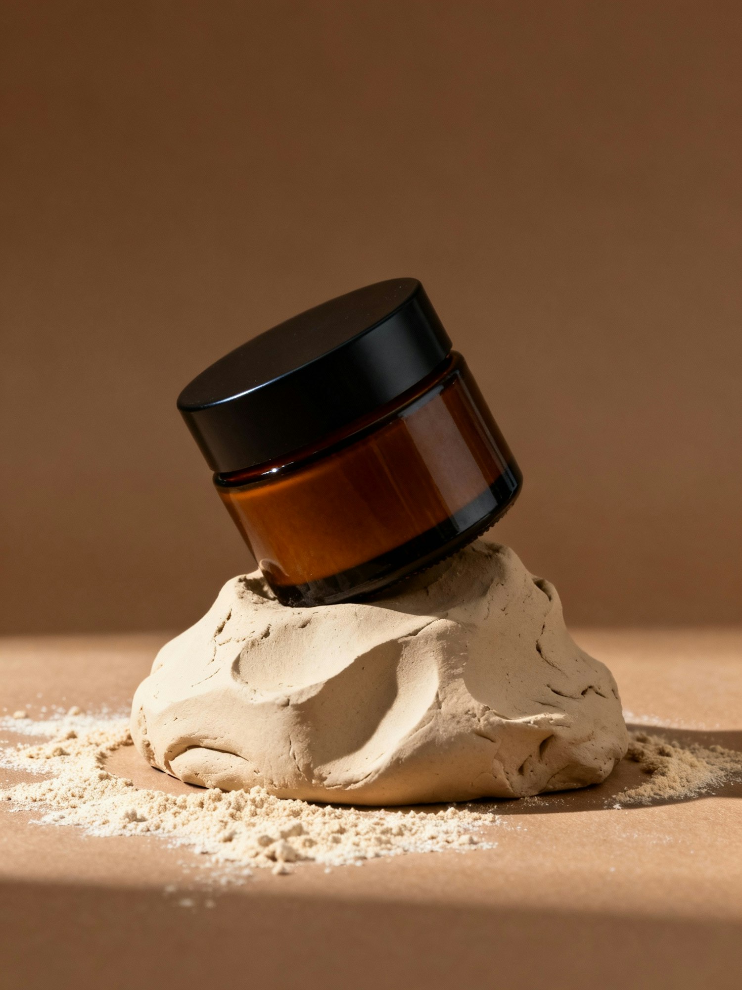 Studio product photography in a refined, sculptural, and organic art direction — matte amber glass packaging with a black lid, minimalist and label-free, placed against a warm brown studio background. The lighting is soft, directional, and diffused from one side, creating gentle shadows and a natural sense of depth. The overall atmosphere is earthy and calm, with warm tones, tactile textures, and a poetic balance between raw materials and crafted elegance. Style inspired by high-end skincare campaigns — natural sophistication, sensory minimalism, and sculptural composition. A wide amber jar placed on a sculpted mound of beige clay, surrounded by fine powder dust as if it had been freshly molded. The jar is slightly tilted, catching soft highlights across its curved surface.