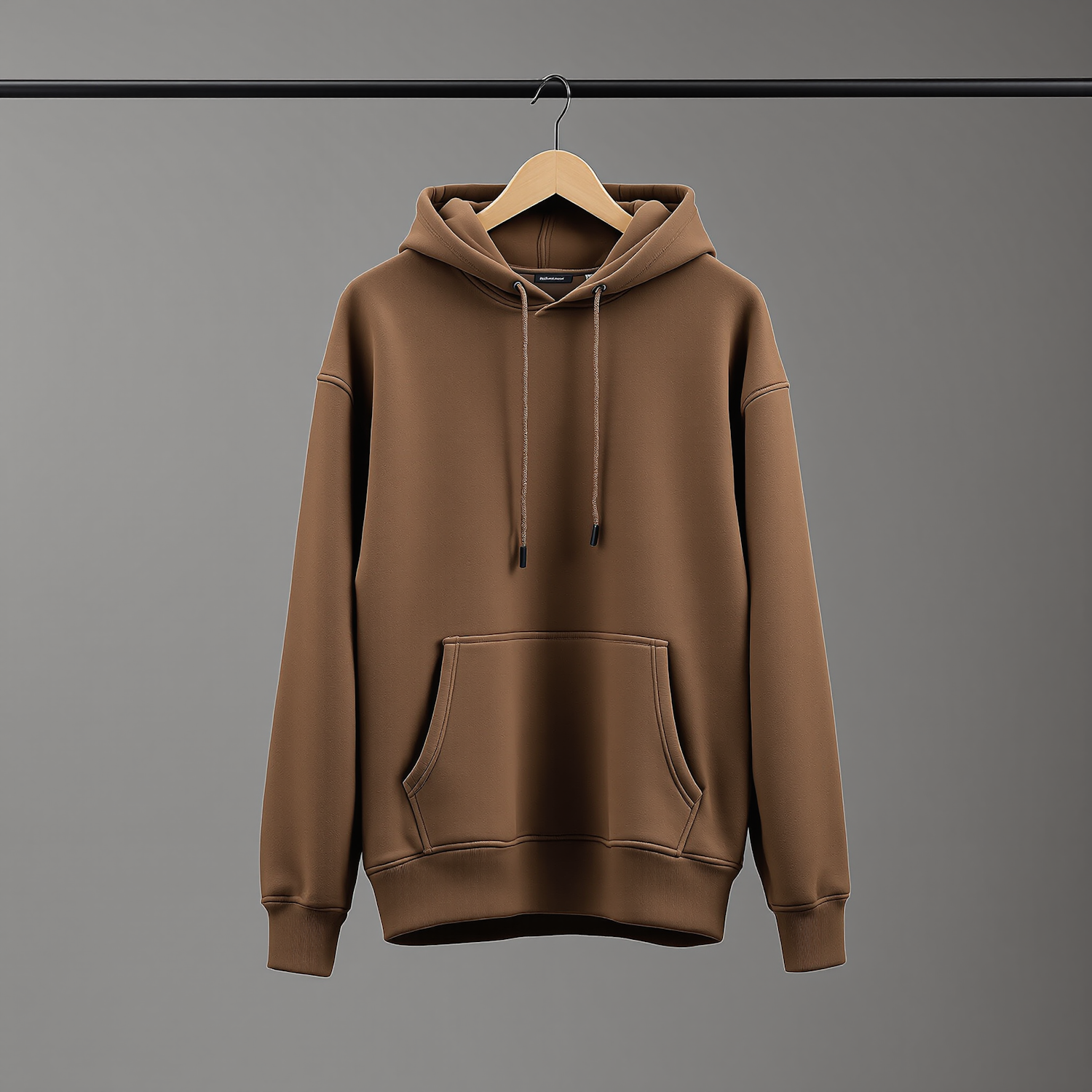 A brown hoodie on a hanger, showcasing its clean design and smooth texture against a neutral gray background.