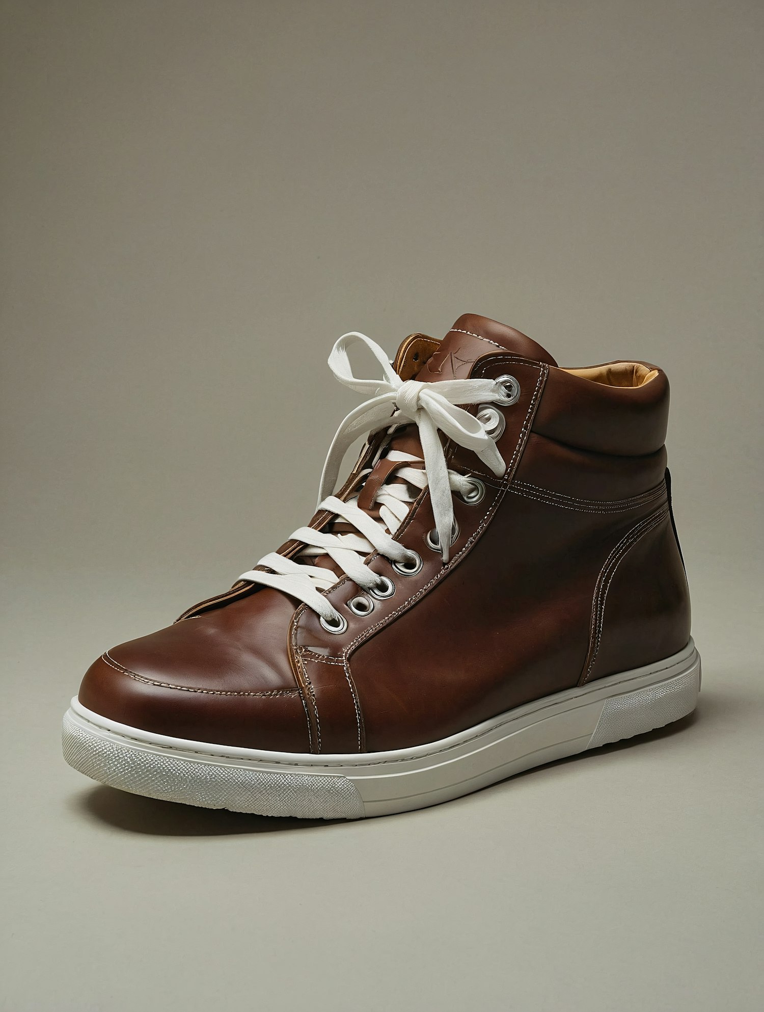 Brown leather high-top sneaker with white laces, silver eyelets, and a thick white sole. Stylish and versatile for casual or semi-formal wear.