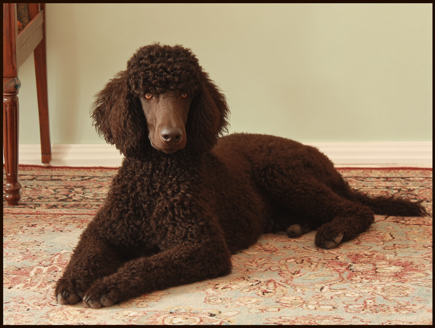 Brown poodle lying on an ornate rug in a cozy room, gazing ahead calmly. Its curly coat adds texture to the warm, vintage-style scene.