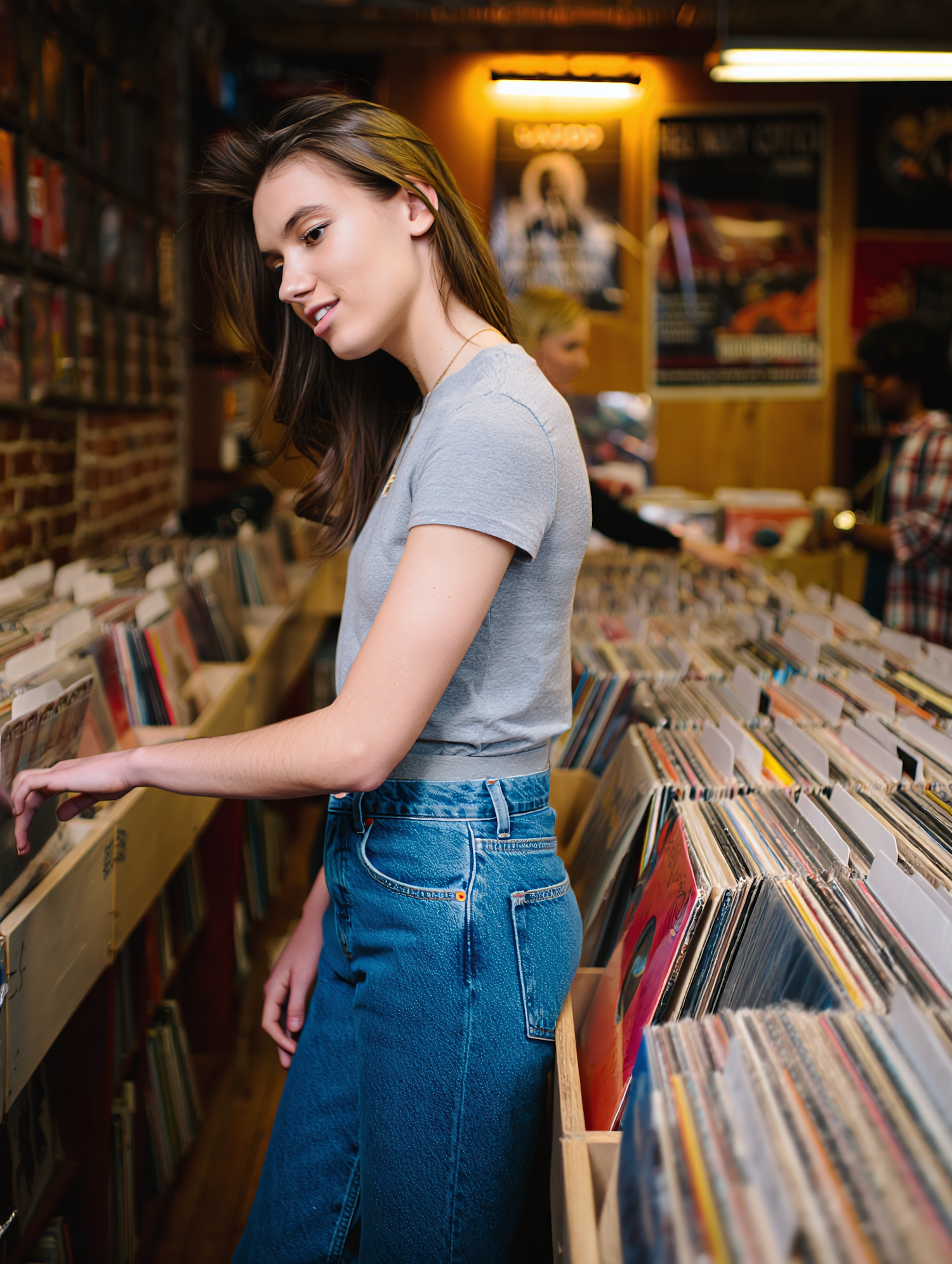 A young woman browses vinyl records in a cozy store with warm lighting and colorful posters, wearing a gray t-shirt and blue jeans.