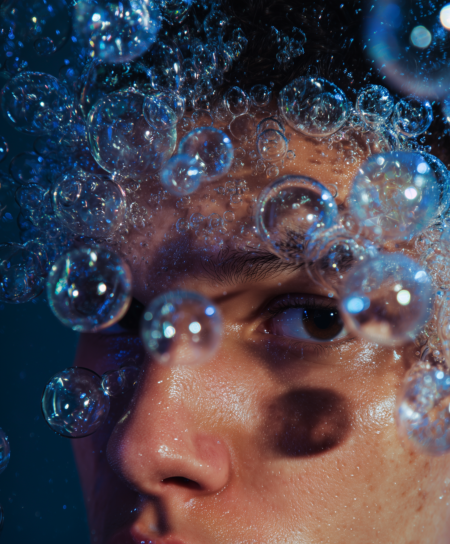A close-up of a face surrounded by bubbles, with dramatic lighting and a surreal, dreamy atmosphere.