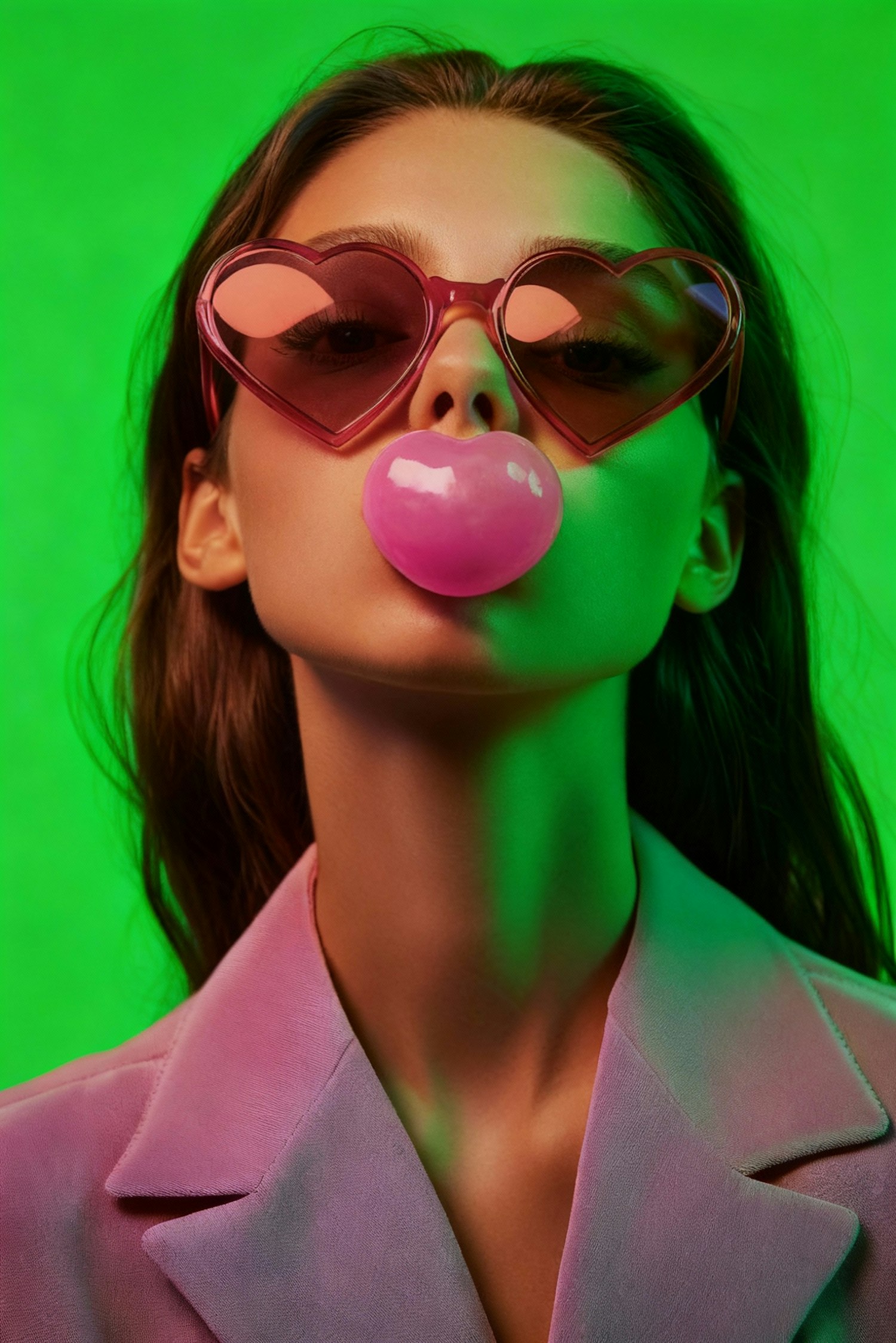 A stylish woman in pink heart-shaped sunglasses and a blazer blows a bubblegum bubble against a vibrant green background.