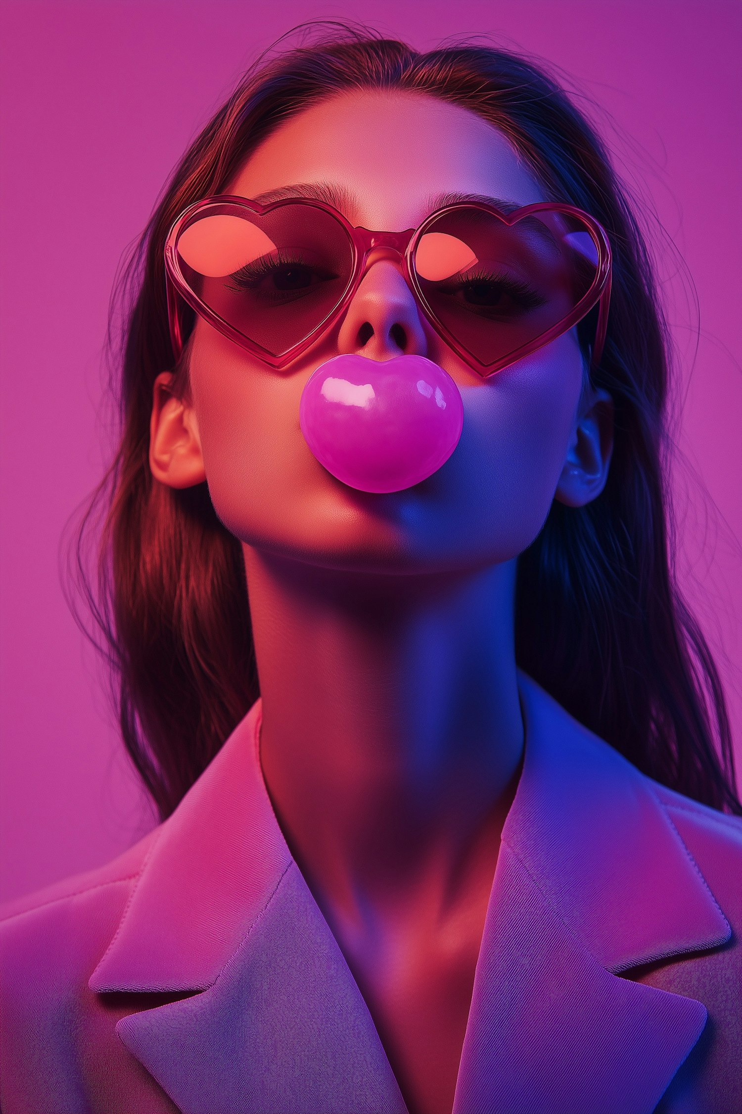 Stylish woman in heart-shaped sunglasses blows pink bubblegum under neon pink and purple lighting, creating a retro pop-art vibe.