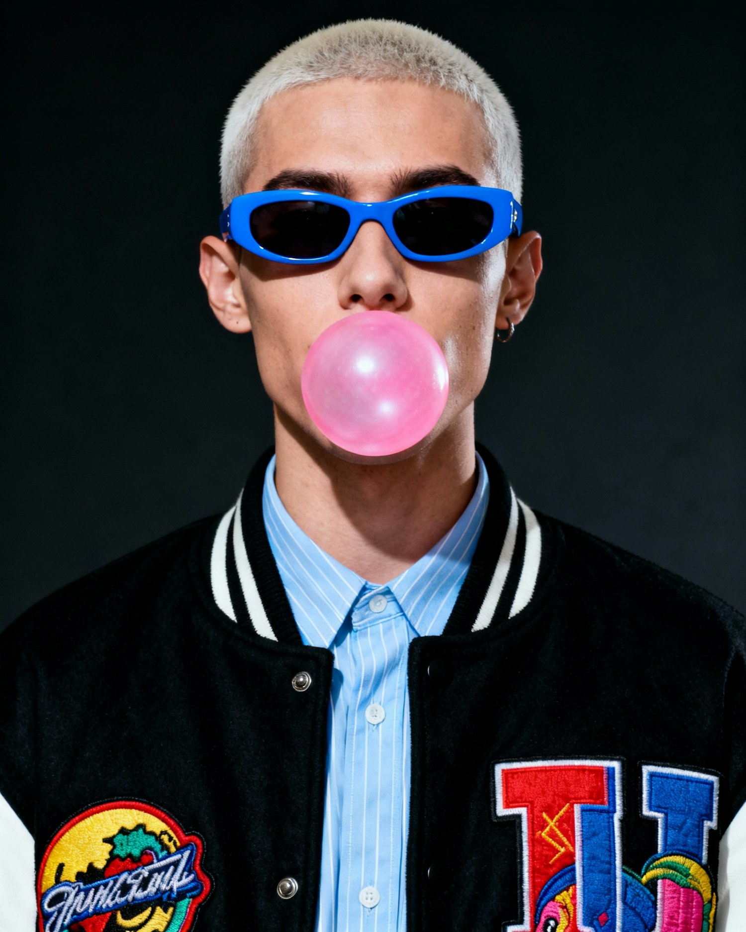 Male model with bleached buzz cut blowing oversized pink bubble gum. Wearing pale blue striped shirt and black varsity bomber with patches, paired with blue-rimmed retro sunglasses. Expression is calm and cool, background is dark with focused beauty light on his face. Editorial shot with retro sportswear and early 2000s attitude.