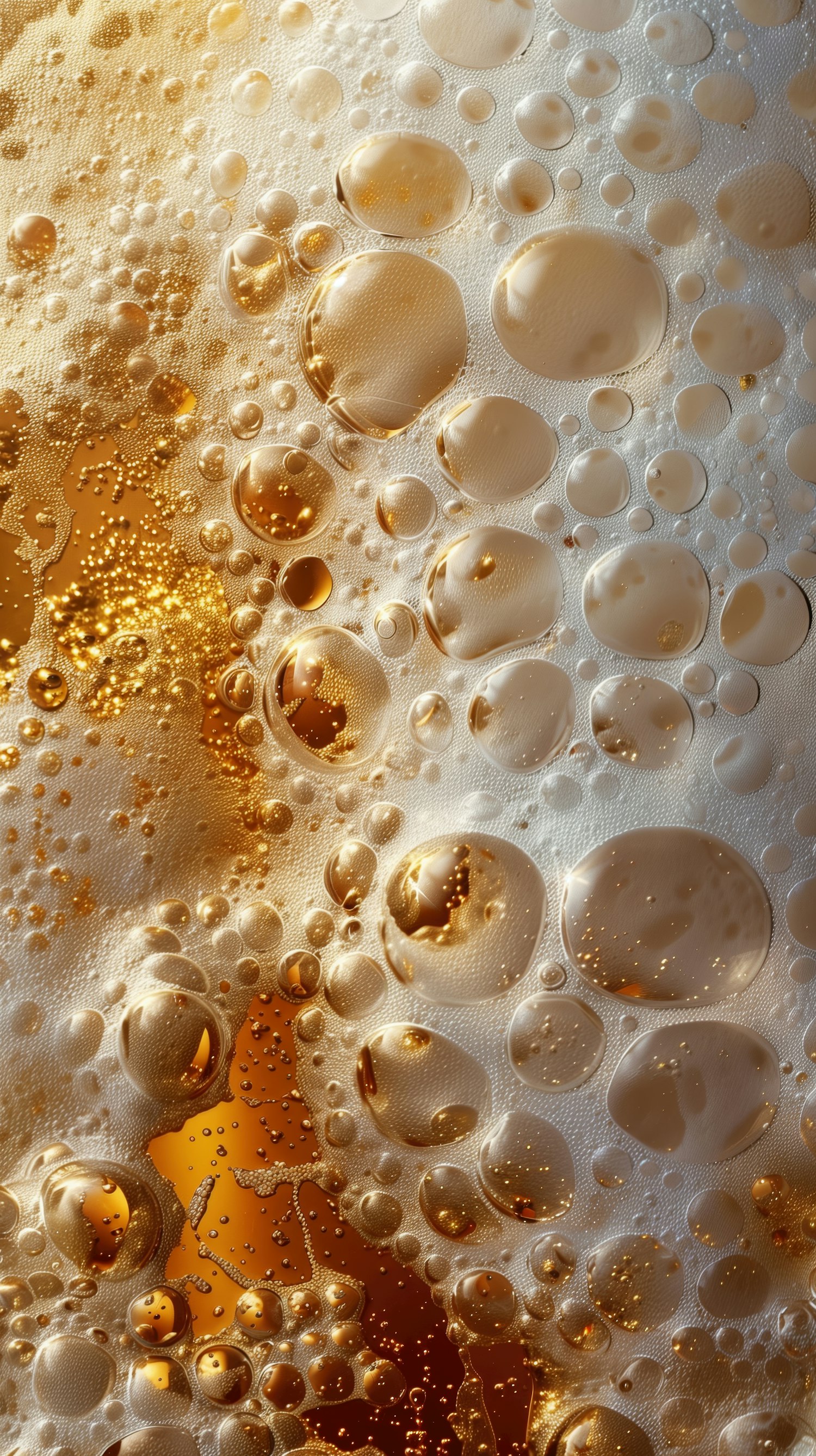Close-up of golden bubbles in a carbonated beverage, creating a shimmering and dynamic pattern against an amber background.