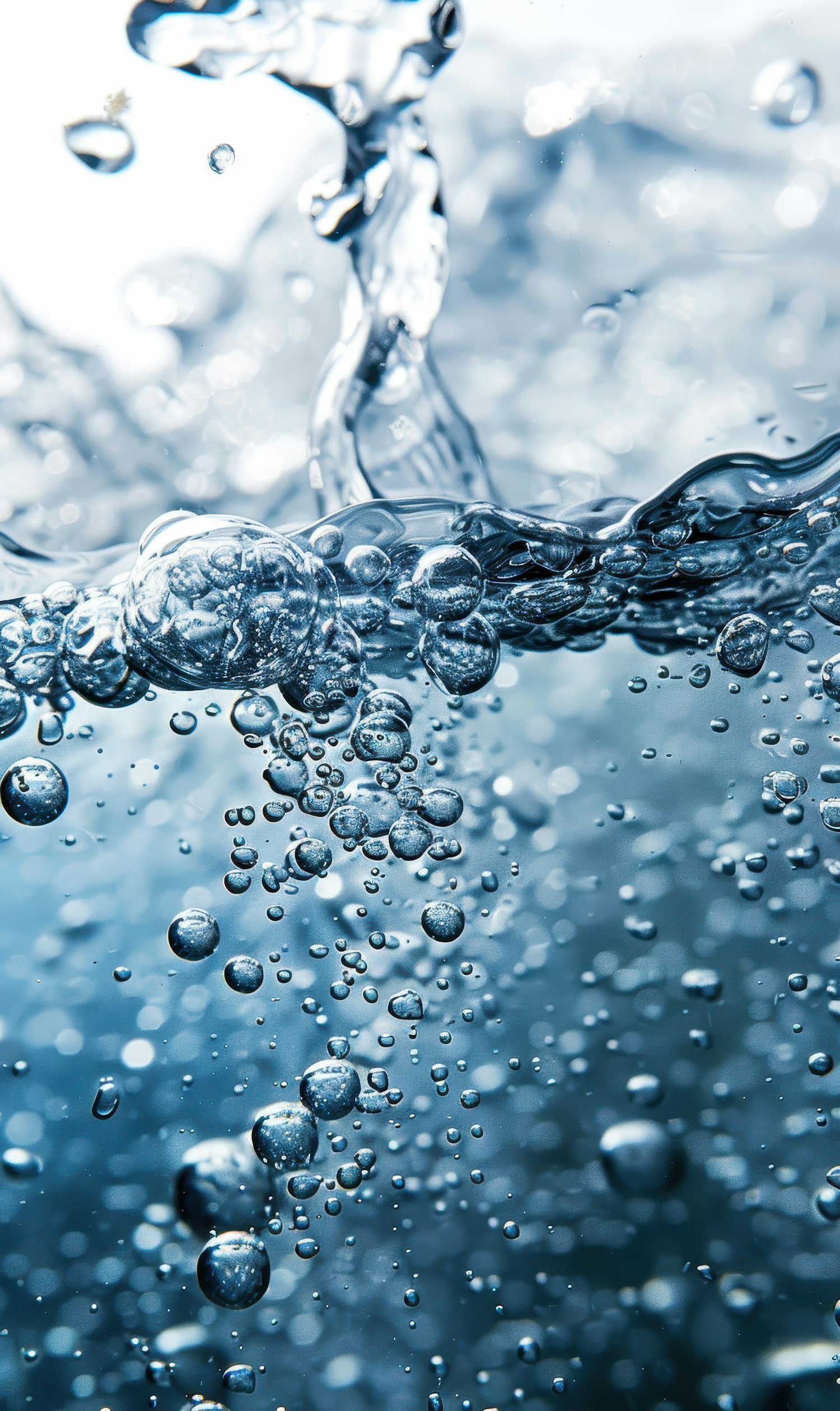 Close-up of vibrant blue water bubbles rising, capturing motion and light reflections in a fresh, dynamic scene.