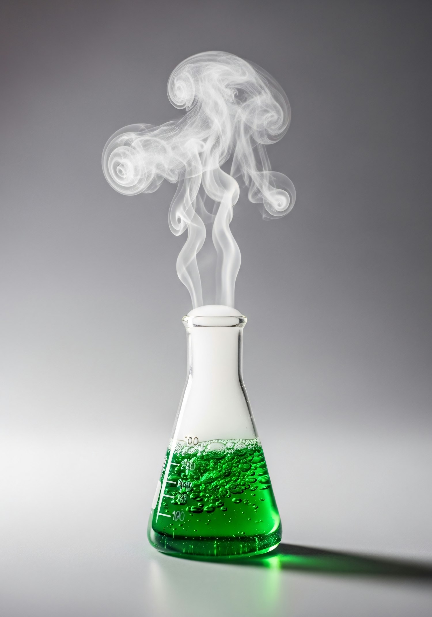 A bubbling green liquid in a flask emits swirling white smoke, set against a neutral gray background.
