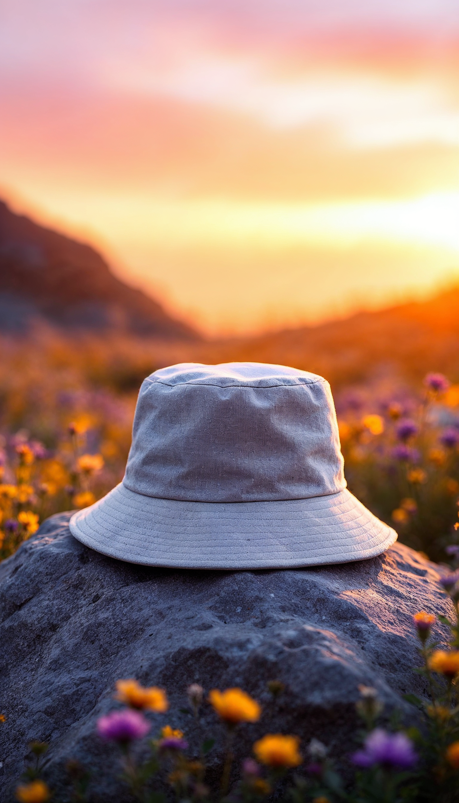 A gray bucket hat on a rock surrounded by colorful wildflowers at sunset, creating a serene and picturesque scene.