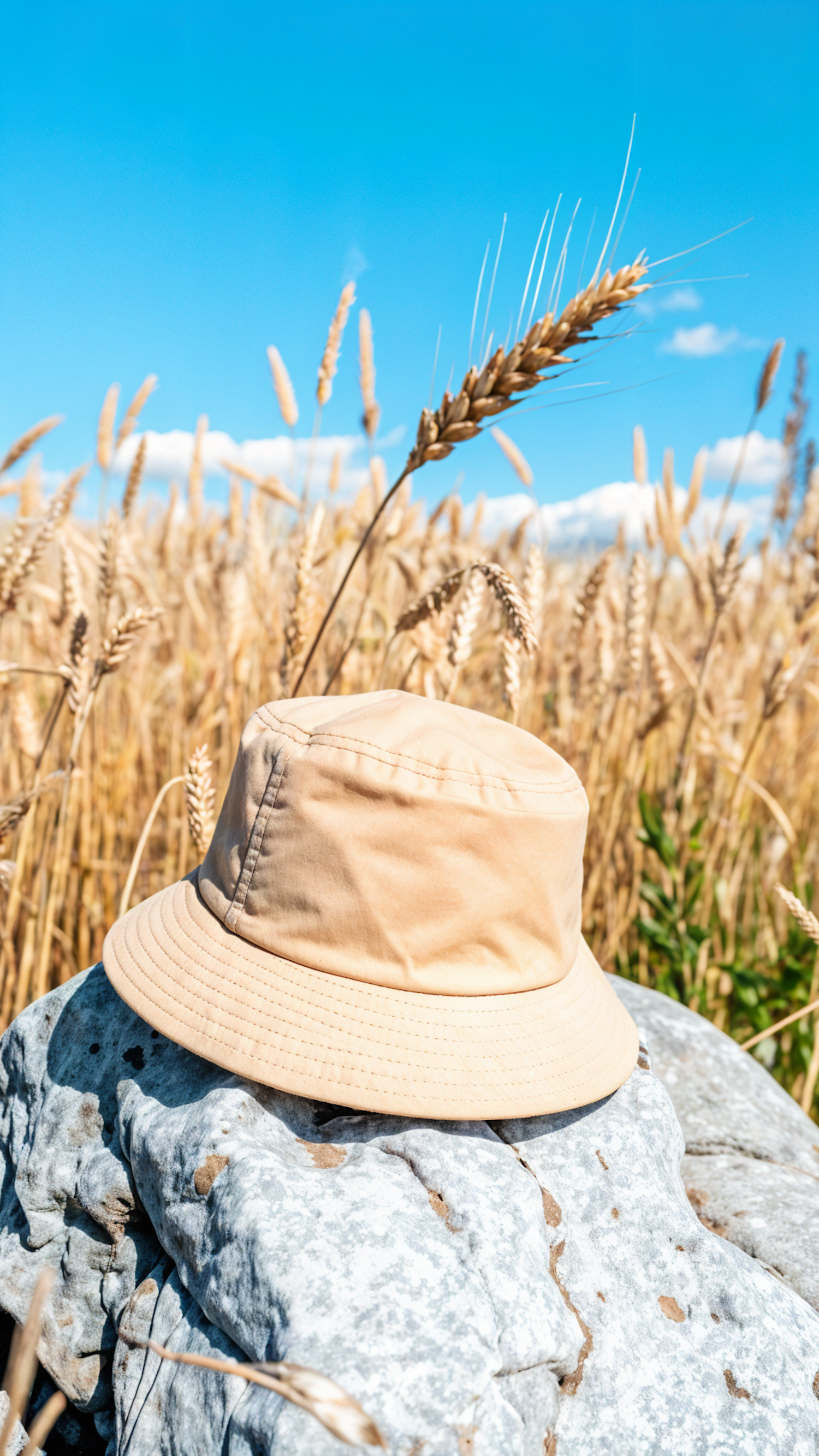 Beige bucket hat on a rock in a golden wheat field under a clear blue sky, capturing a serene summer vibe.