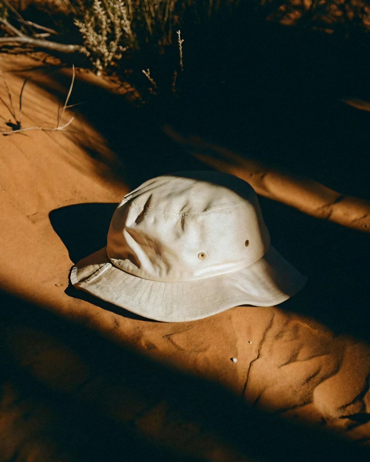 Beige bucket hat on sunlit sand with plant shadows, creating a warm, desert-like scene.