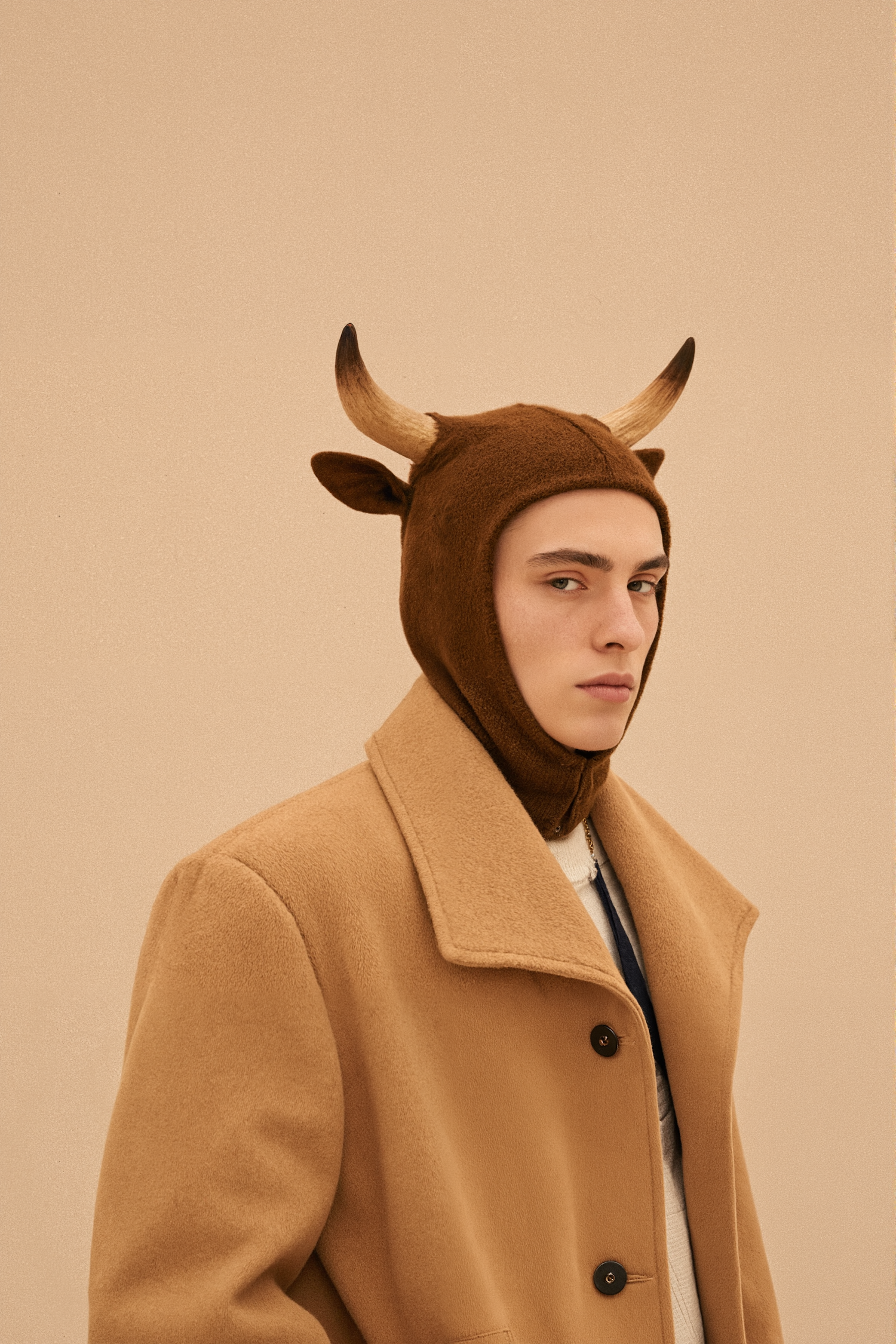 A young man in a camel coat and a bull-themed hat with horns poses against a beige background, blending playful and stylish elements.