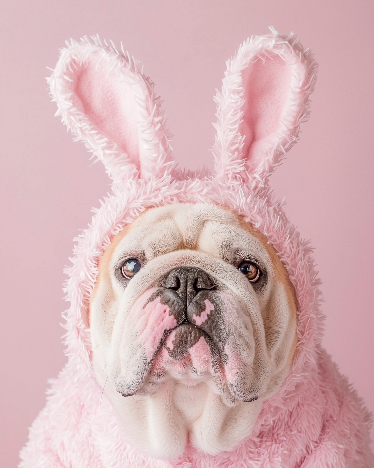 Adorable English bulldog in a fluffy pink bunny costume against a pastel pink background. Perfect mix of cute and funny!