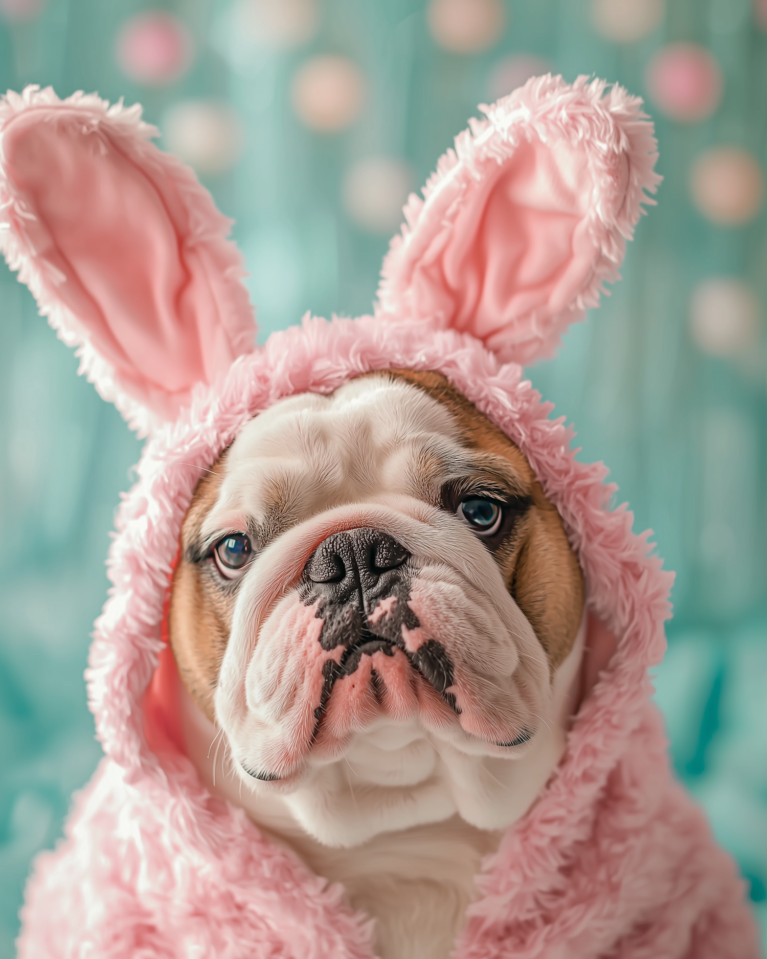 Adorable English Bulldog in a pink bunny costume with floppy ears, set against a pastel teal and pink background. Perfect for Easter vibes!