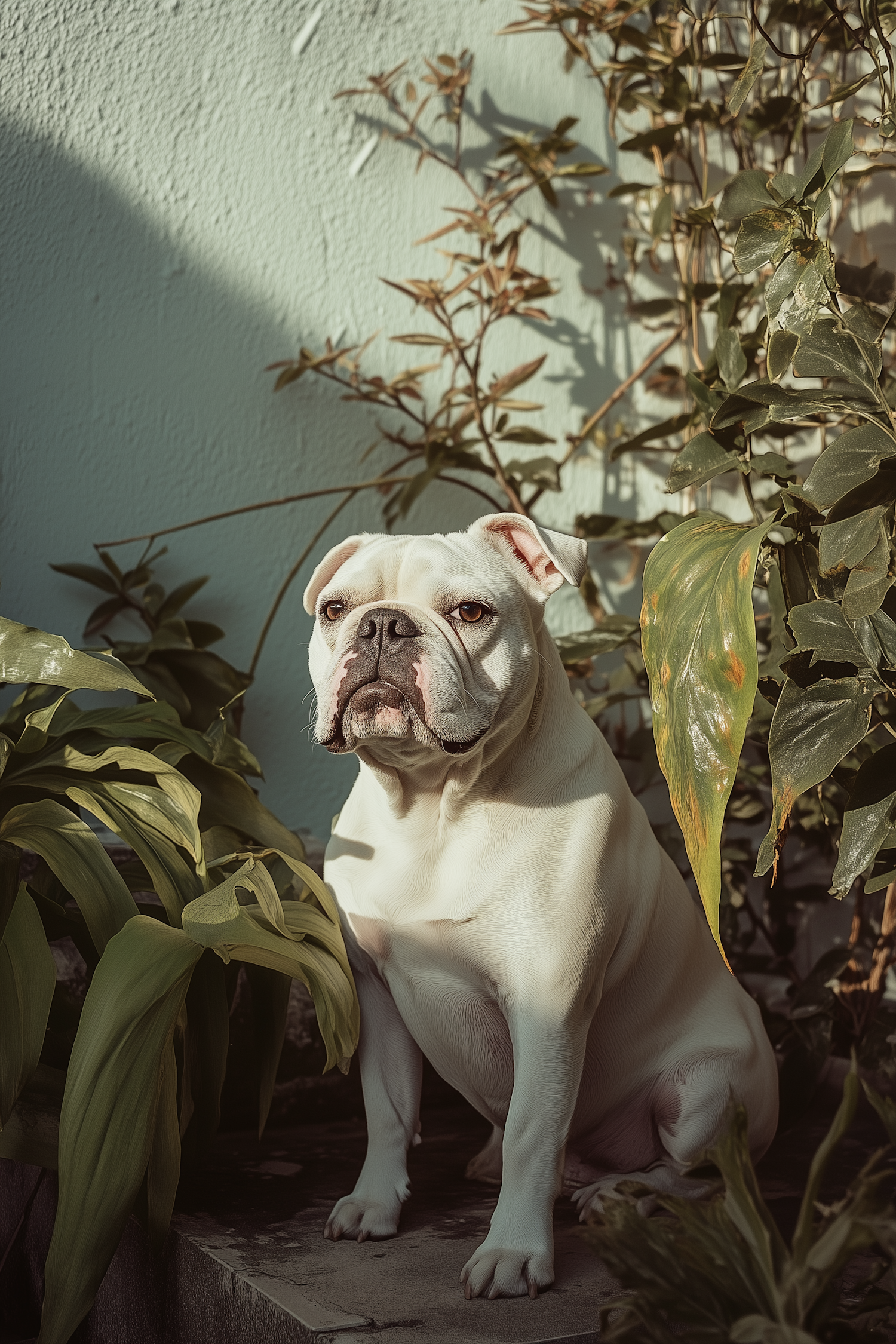 White bulldog sitting among lush green foliage, bathed in soft sunlight, creating a serene and natural atmosphere.