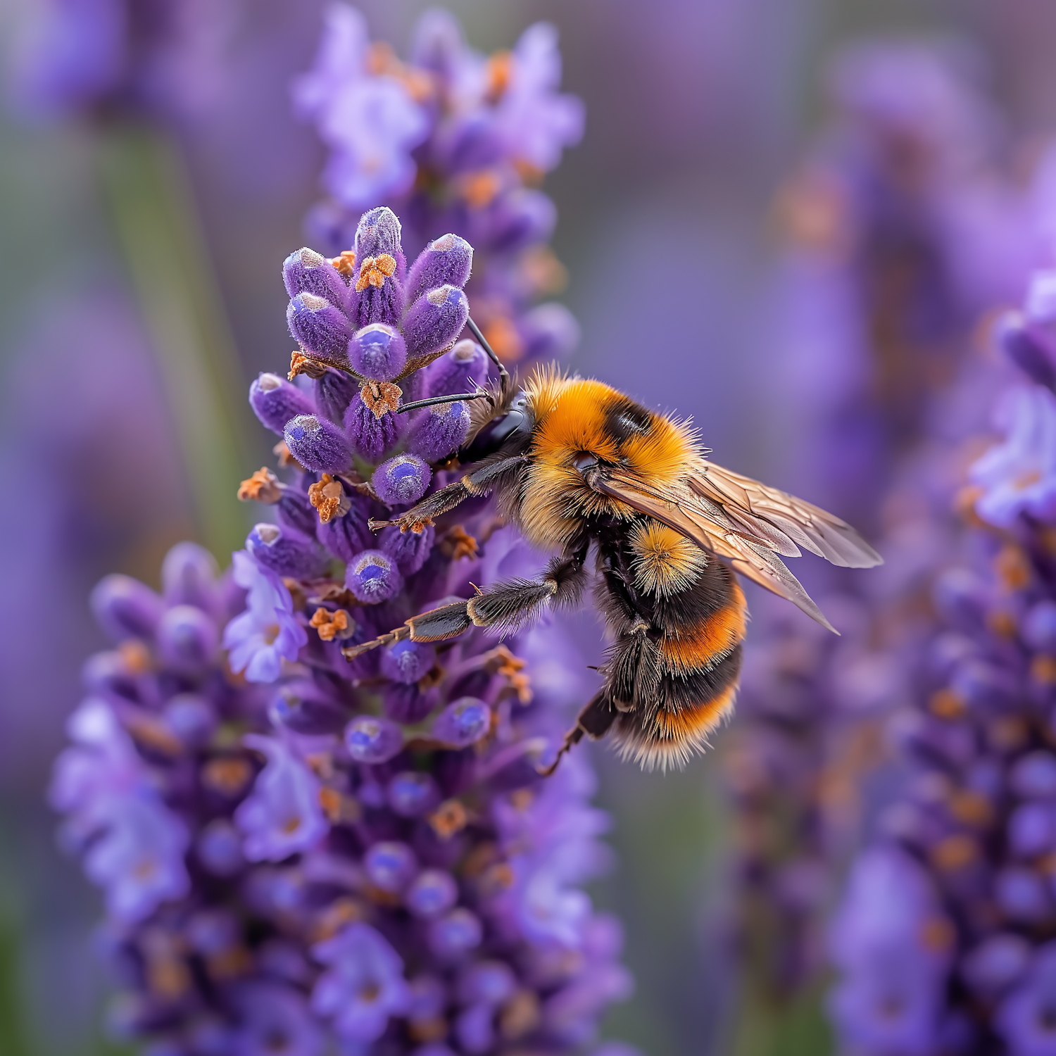 Close-up of a bumblebee on a lavender flower, showcasing vibrant colors and intricate details of nature.