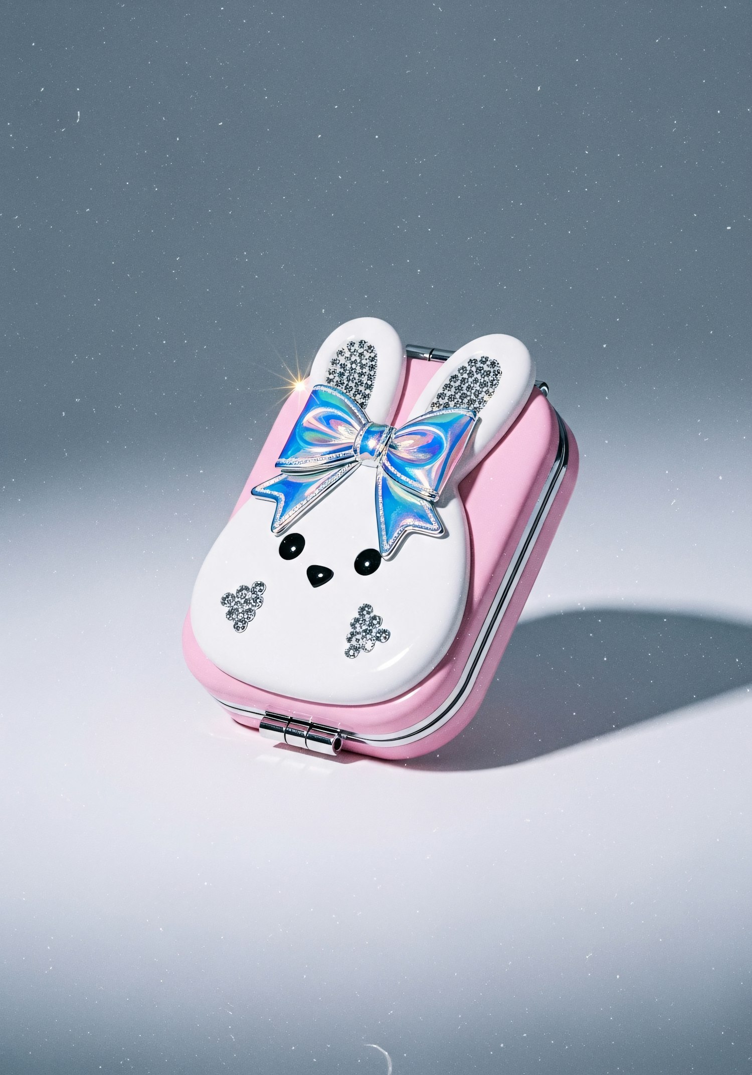 A cute bunny-shaped compact case with rhinestones and a shiny blue bow, set against a sparkling gray background.
