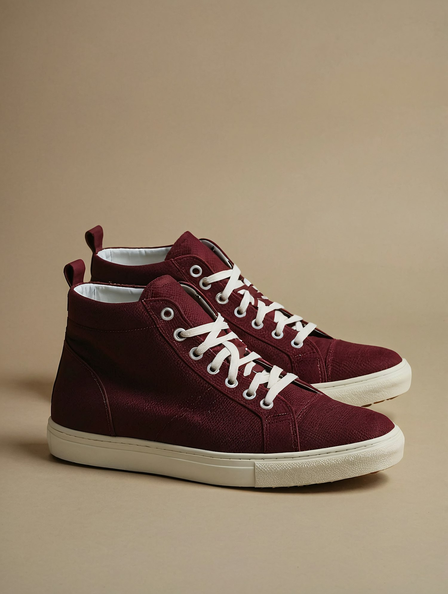 Burgundy high-top sneakers with white laces and soles, perfect for casual wear. Stylish and versatile with a textured fabric finish.